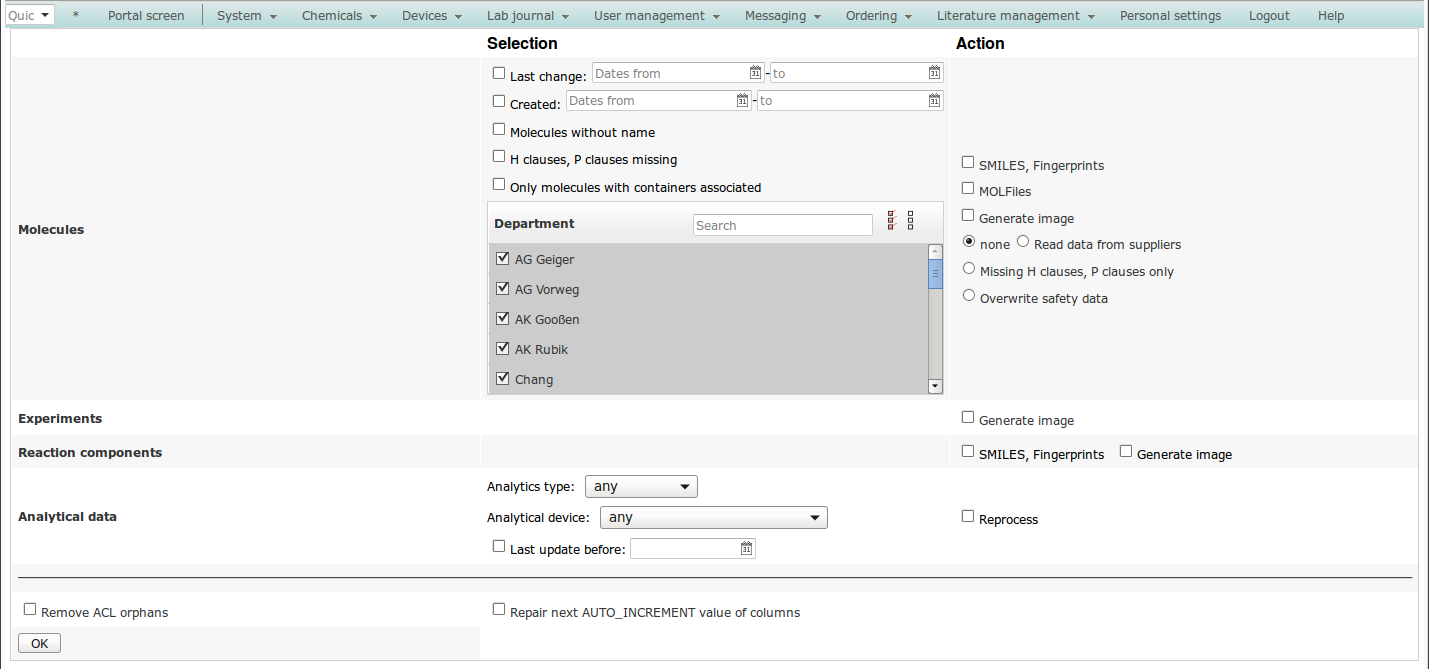 - SMILES, Fingerprints: erzeugt Hilfsdaten für die Struktursuche neu SMILES, Fingerprints: recalculates auxiliary data for structure searches