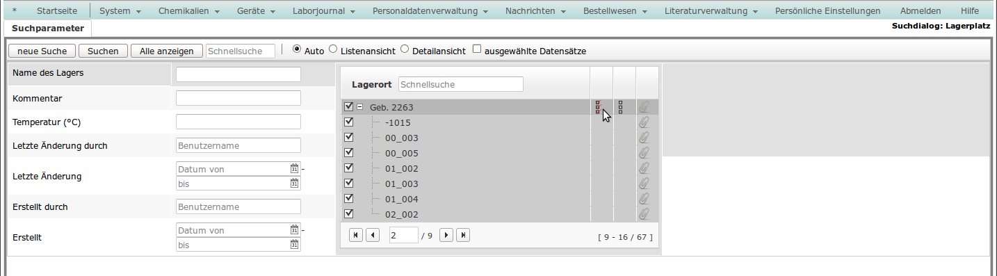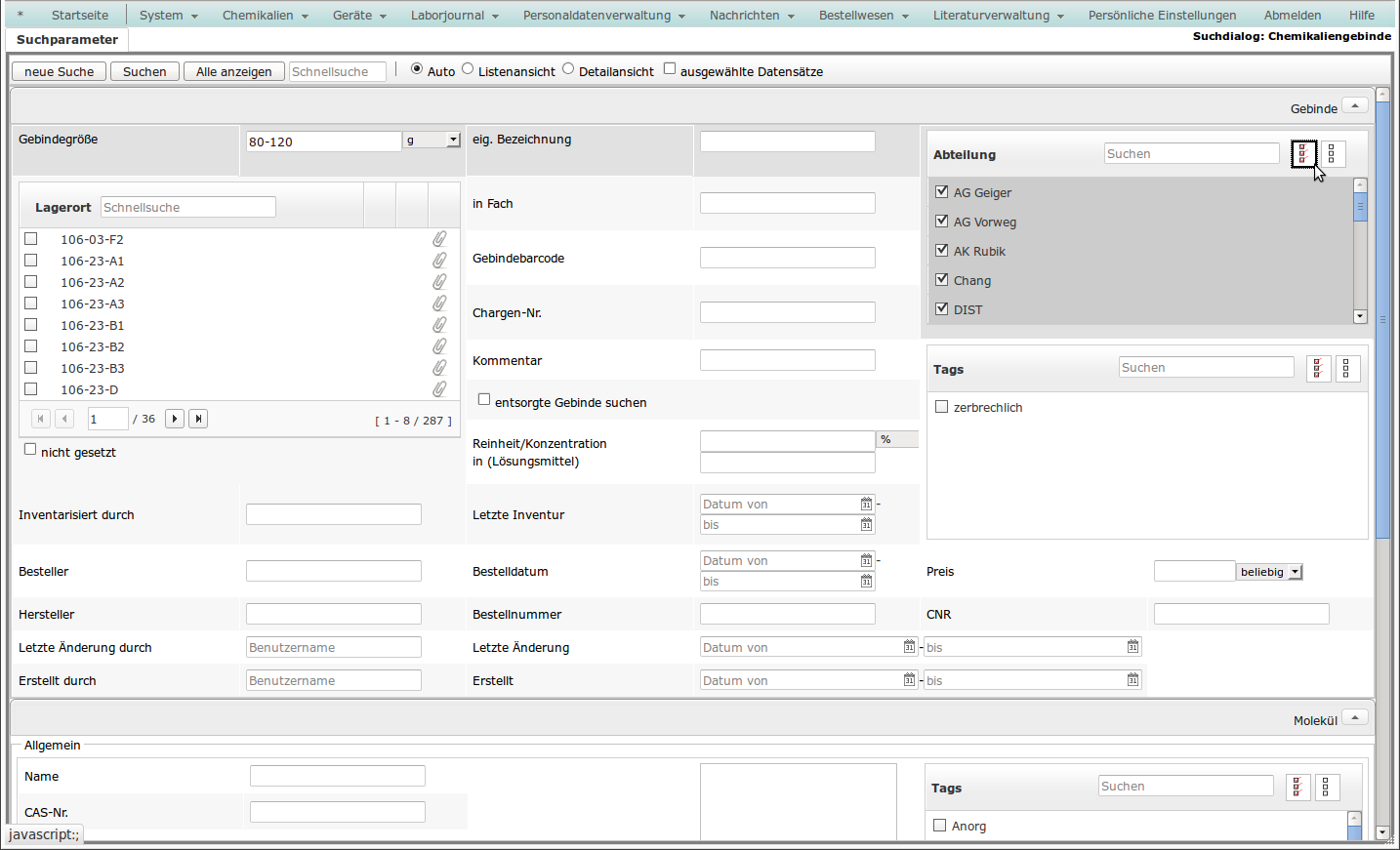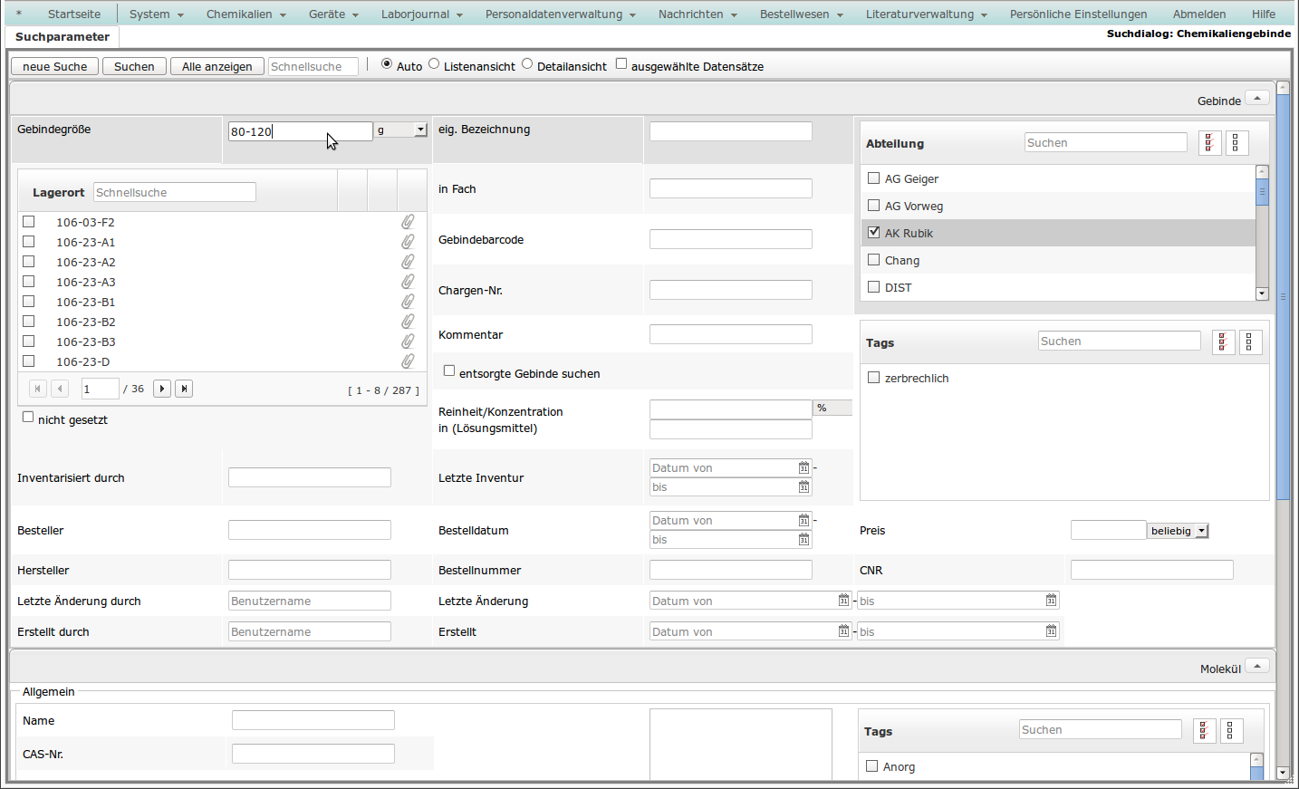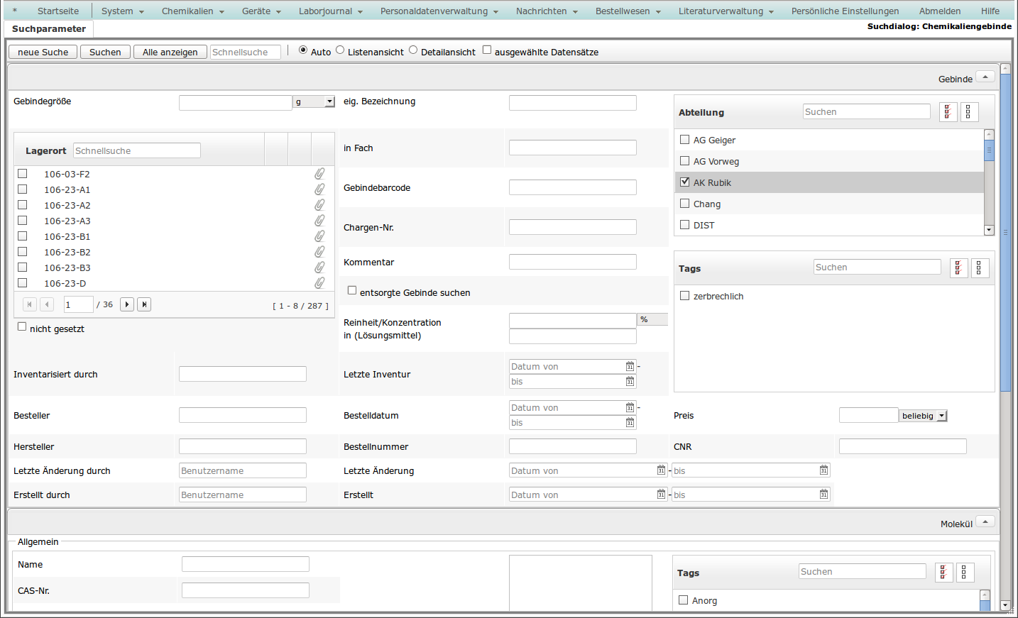 Im oberen Teil des Formulars können Sie nach Eigenschaften des Gebindes suchen, Menge, Lagerort oder Chargen-Nr.