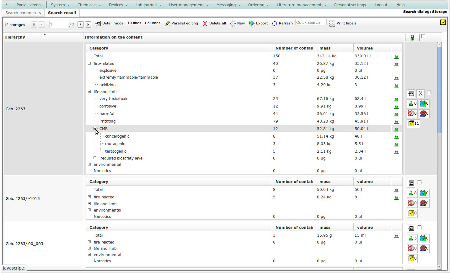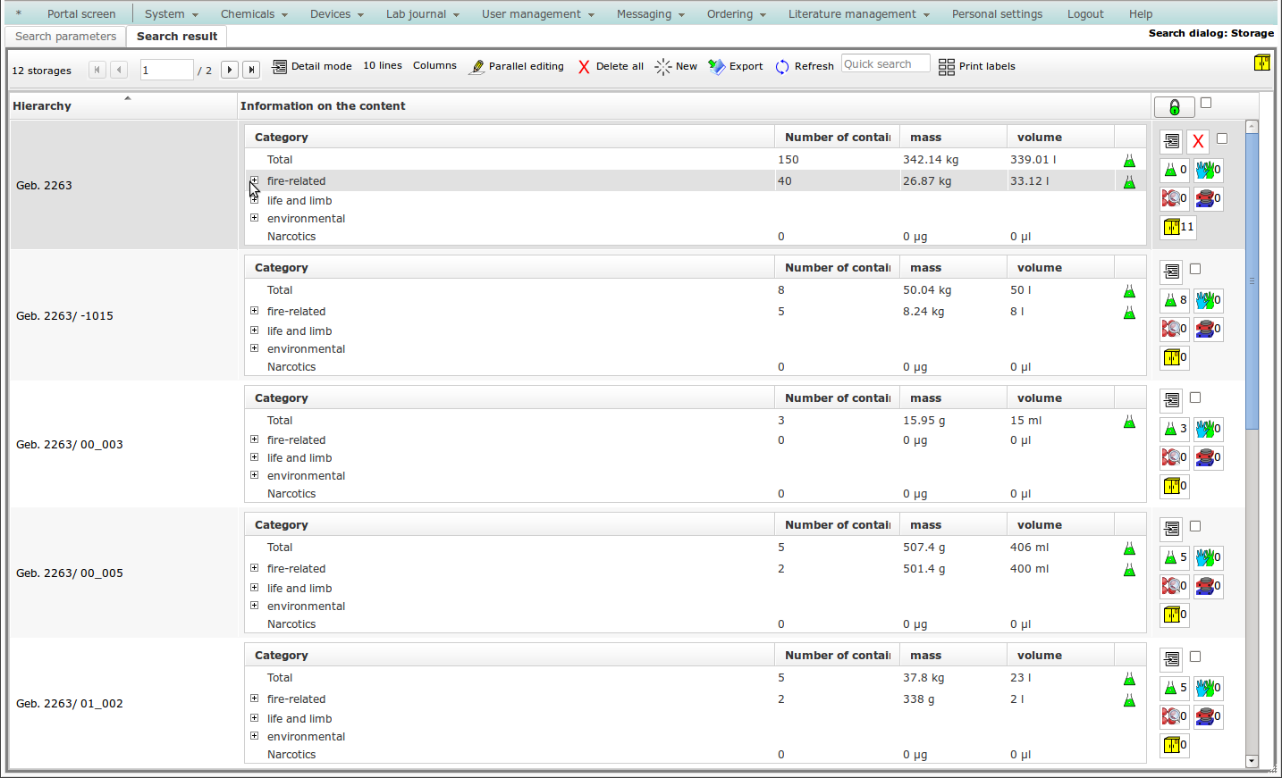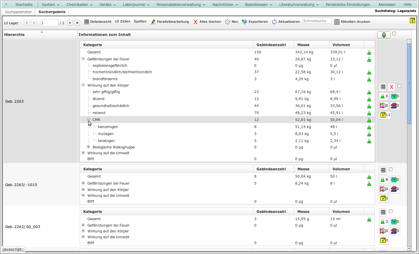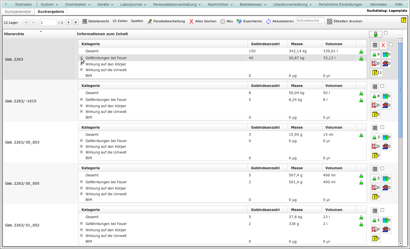 In der Ergebnisliste wird der Inhalt eines Lagers und untergeordneter Einheiten zusammengefaßt.