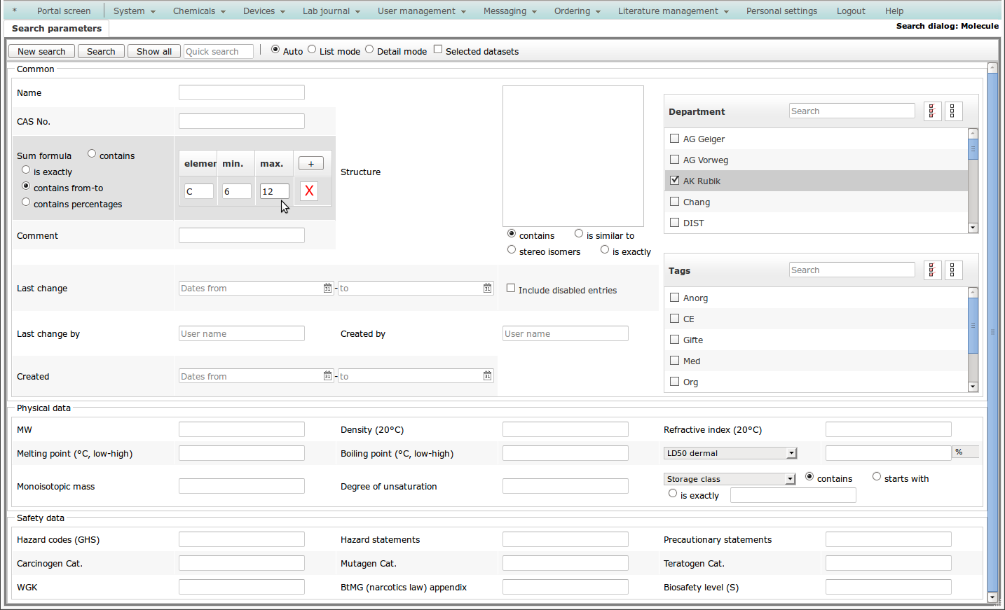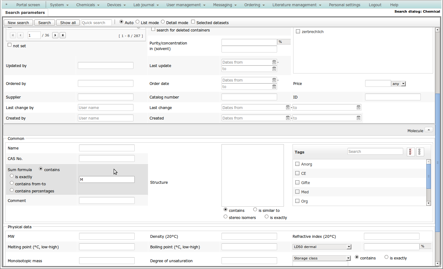 When searching for substances, you can specify general criteria like name, CAS No. or (sub-)structure, but also specify desired phys. properties or safety data.