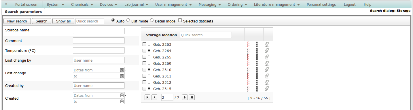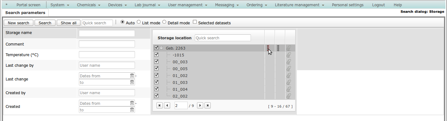 When searching for storages, you can specify criteria like name, temperature or metadata of the database entry.