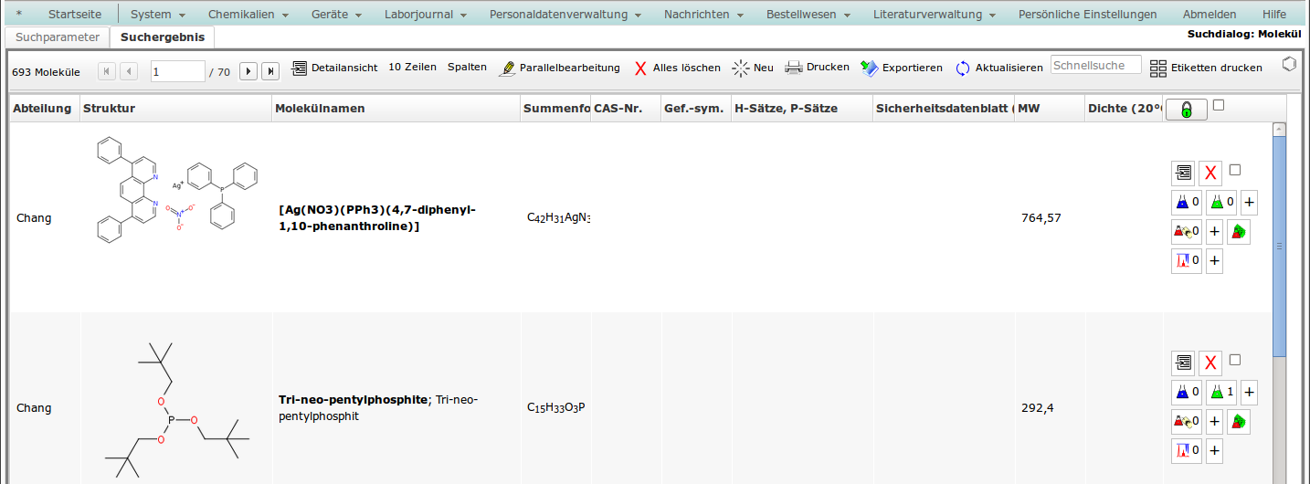 - Das Symbol ganz rechts zeigt an, aus welchem Objekttyp die Ergebnisliste besteht, z.B. Substanzen, Gebinde oder Experimente. The symbol on the very right indicates the object type of the current result list, e.g. substances, containers or experiments.