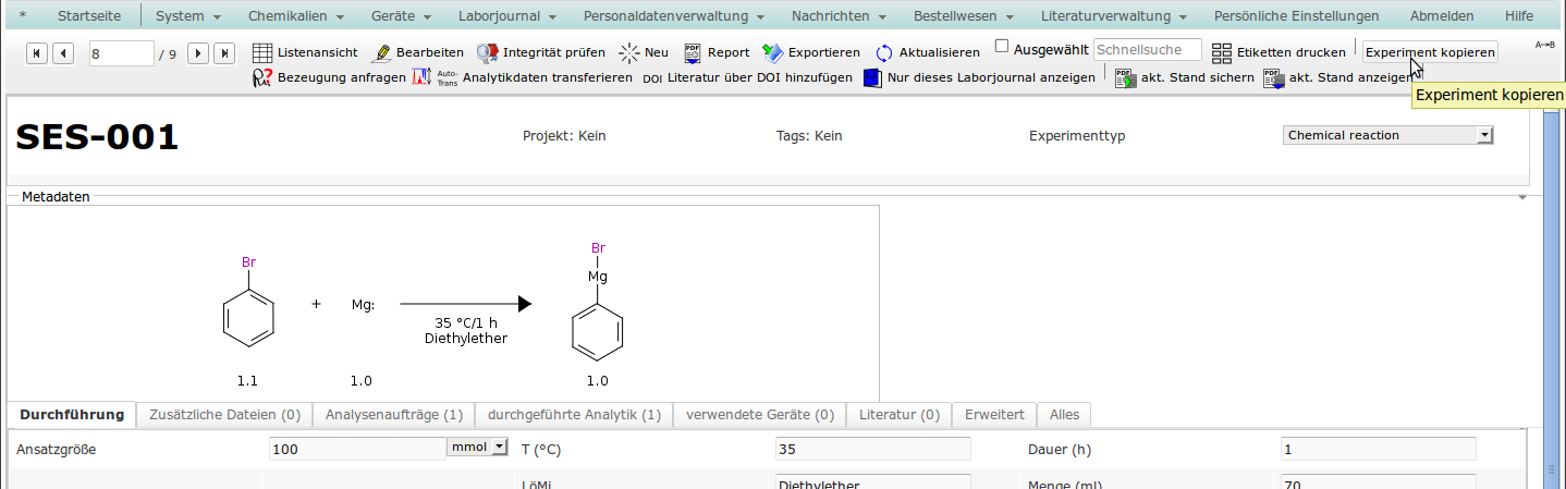 - die Reaktionsbedingungen (es werden die Bedingungen angeboten, für die im Prototypen Werte gesetzt waren) sowie the experimental conditions, as they were used in the prototype and