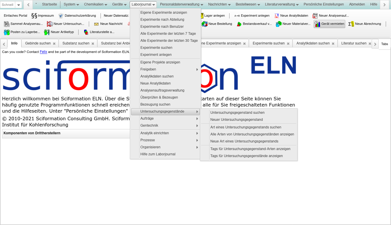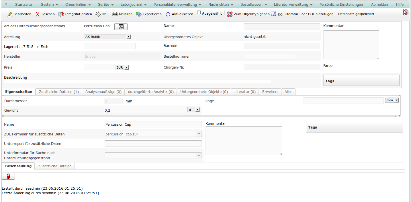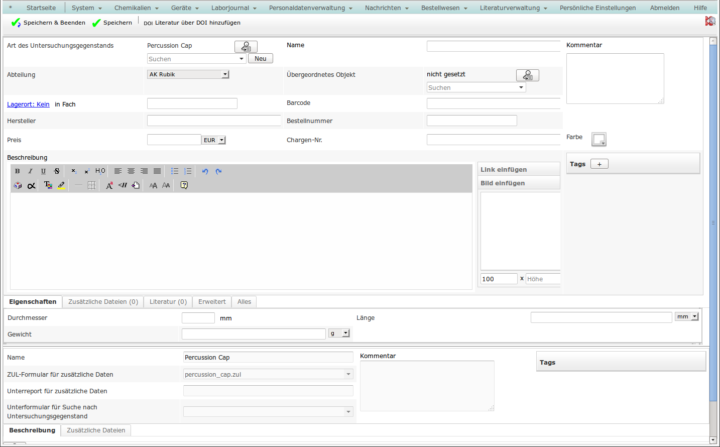Um in der Datenbank einen neuen Untersuchungsgegenstand einzutragen, wählen Sie den Menüpunkt "Laborjournal > Untersuchungsgegenstände > Neuer Untersuchungsgegenstand". To create a dataset for a new object, open "Lab journal > Objects for expermients > New specimen" in the menu.