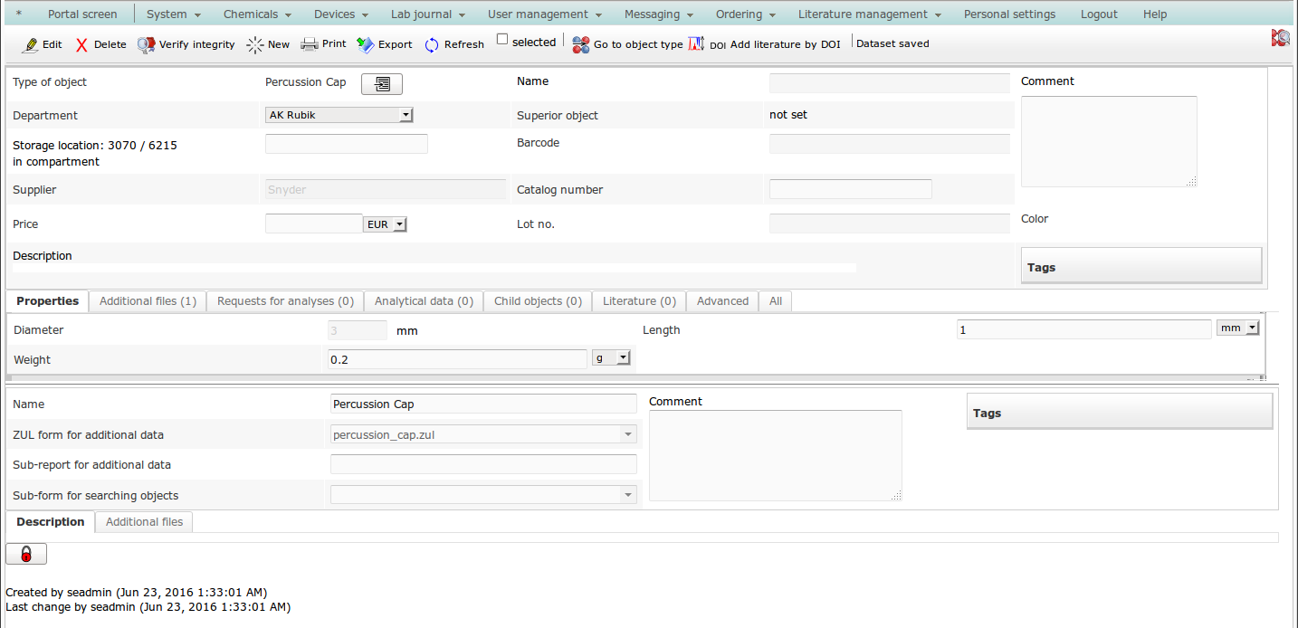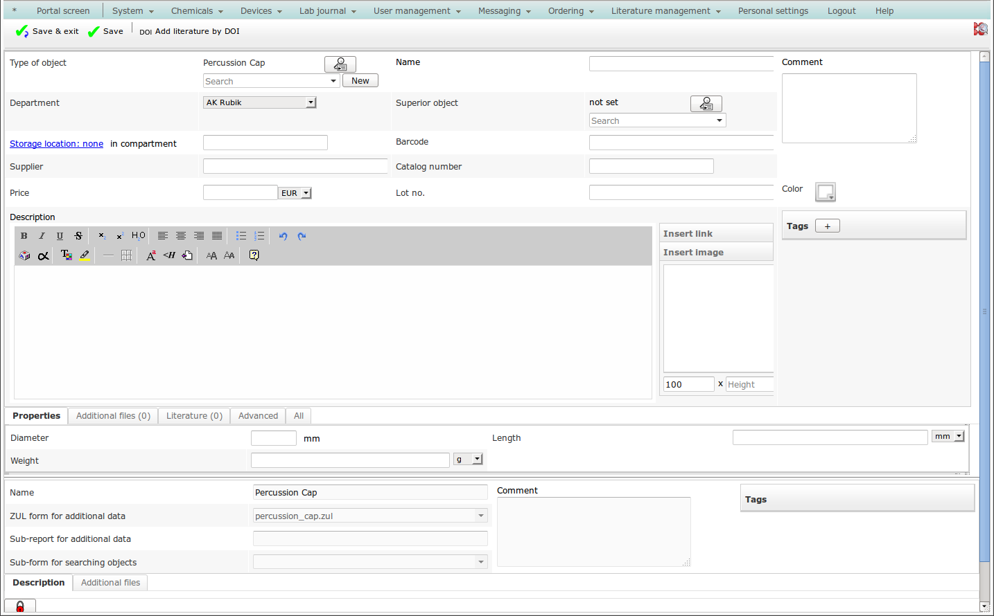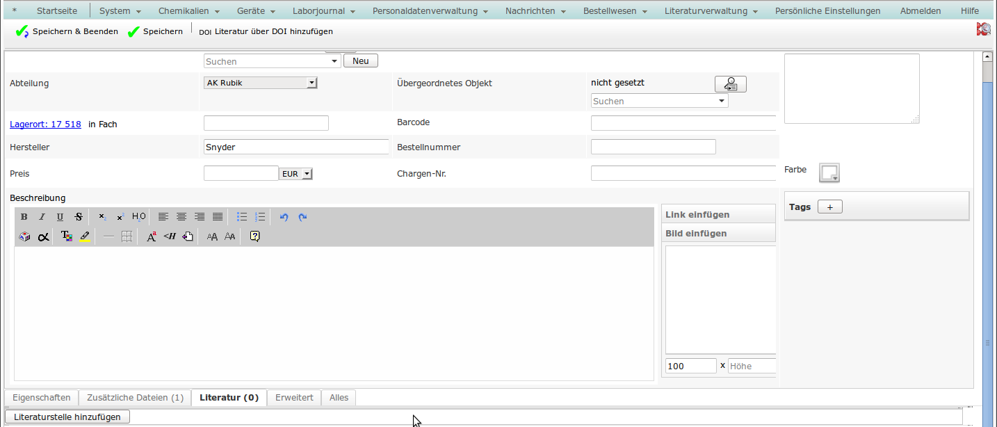 Geben Sie im Formular den Namen oder die Chargen-Nr. sowie ggf. eine Beschreibung oder den Lagerort ein - die zu erfassenden Daten hängen sehr vom Objekt und den spezifischen Anforderungen ab, ebenso die zusätzlichen Felder im Reiter "Eigenschaften". Enter the object name or the lot number and maybe the a description or the storage location - the required data depend on object and specific requirements, as the additional fields in the "Properties" tab do.