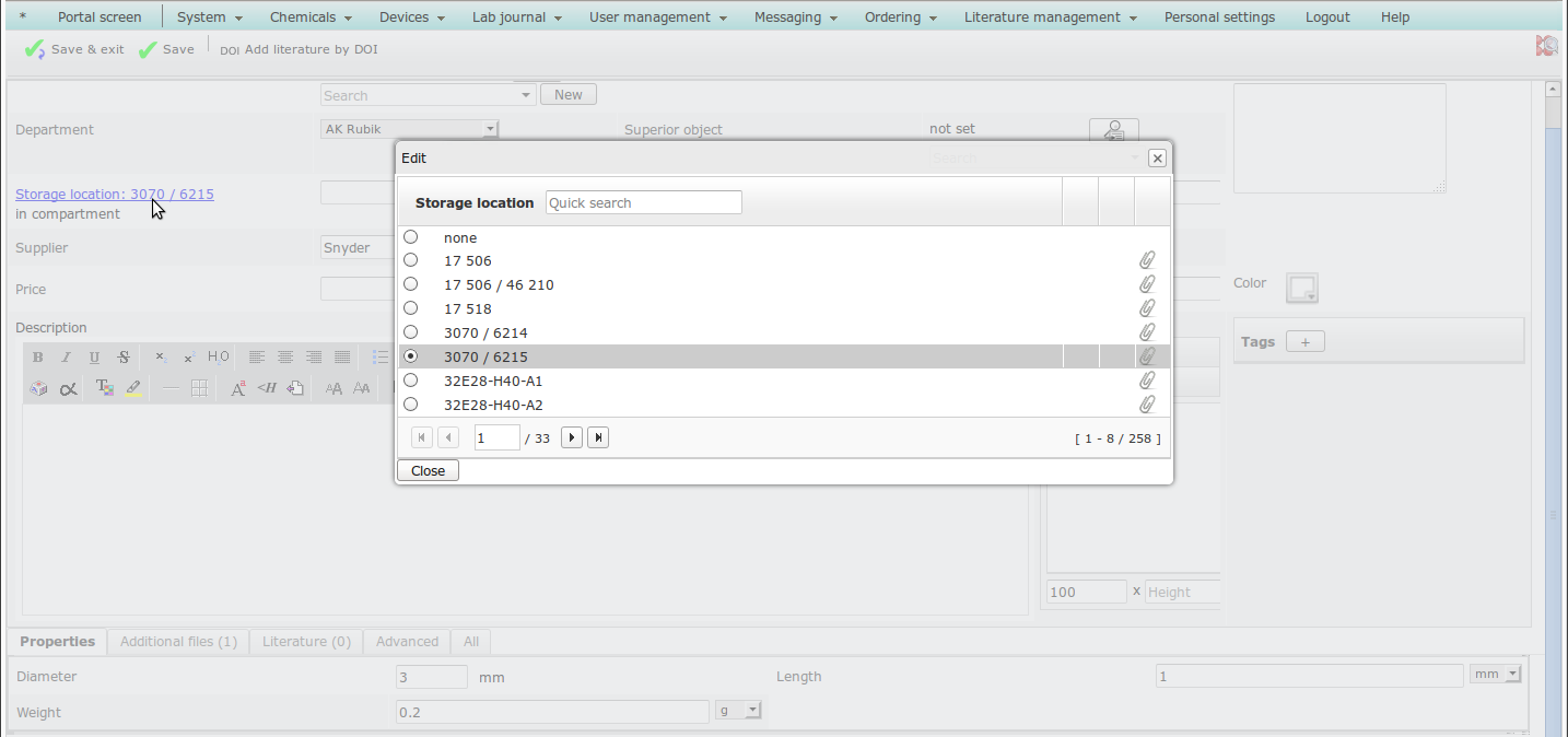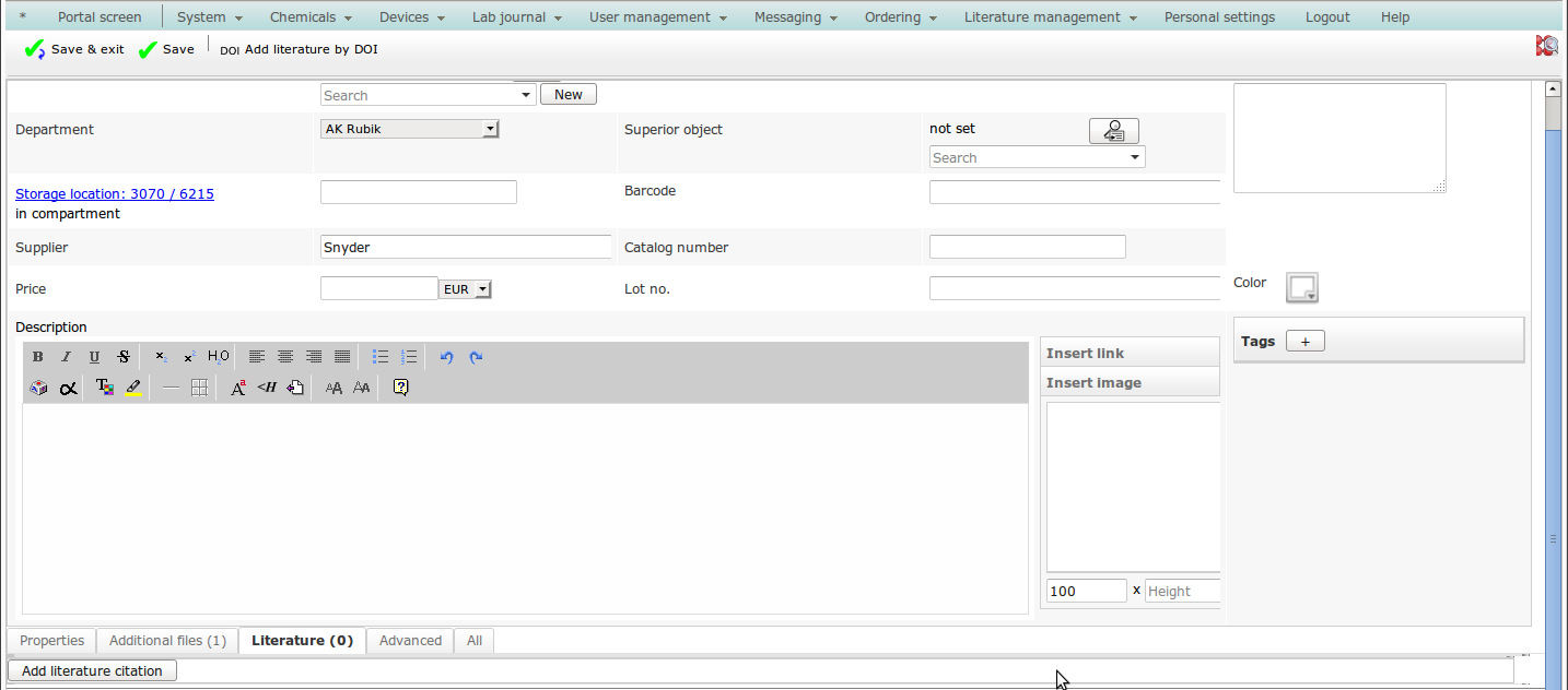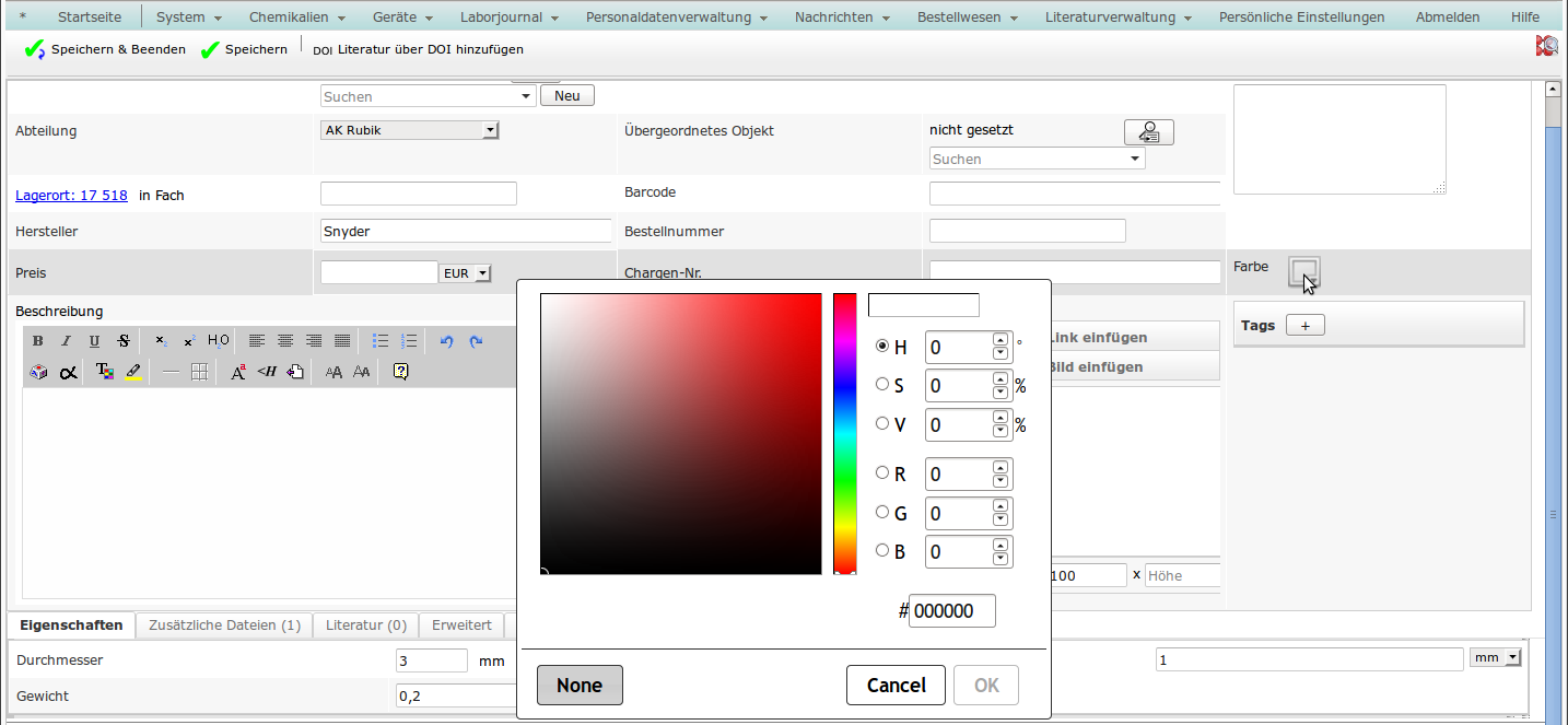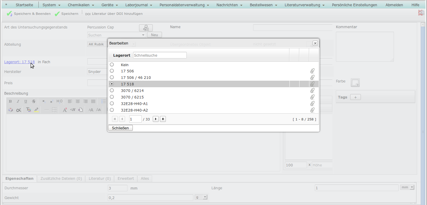 Geben Sie im Formular den Namen oder die Chargen-Nr. sowie ggf. eine Beschreibung oder den Lagerort ein - die zu erfassenden Daten hängen sehr vom Objekt und den spezifischen Anforderungen ab, ebenso die zusätzlichen Felder im Reiter "Eigenschaften". Enter the object name or the lot number and maybe the a description or the storage location - the required data depend on object and specific requirements, as the additional fields in the "Properties" tab do.