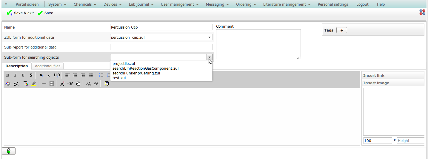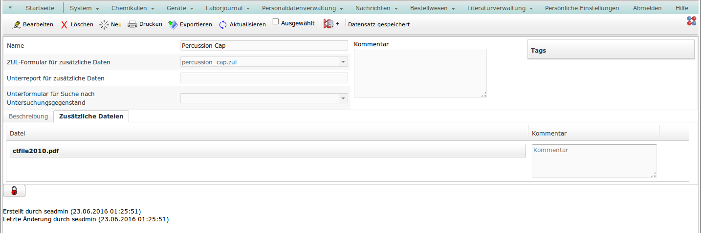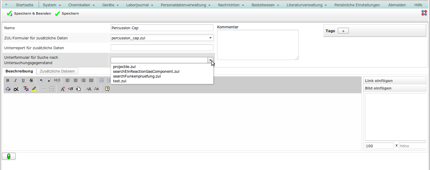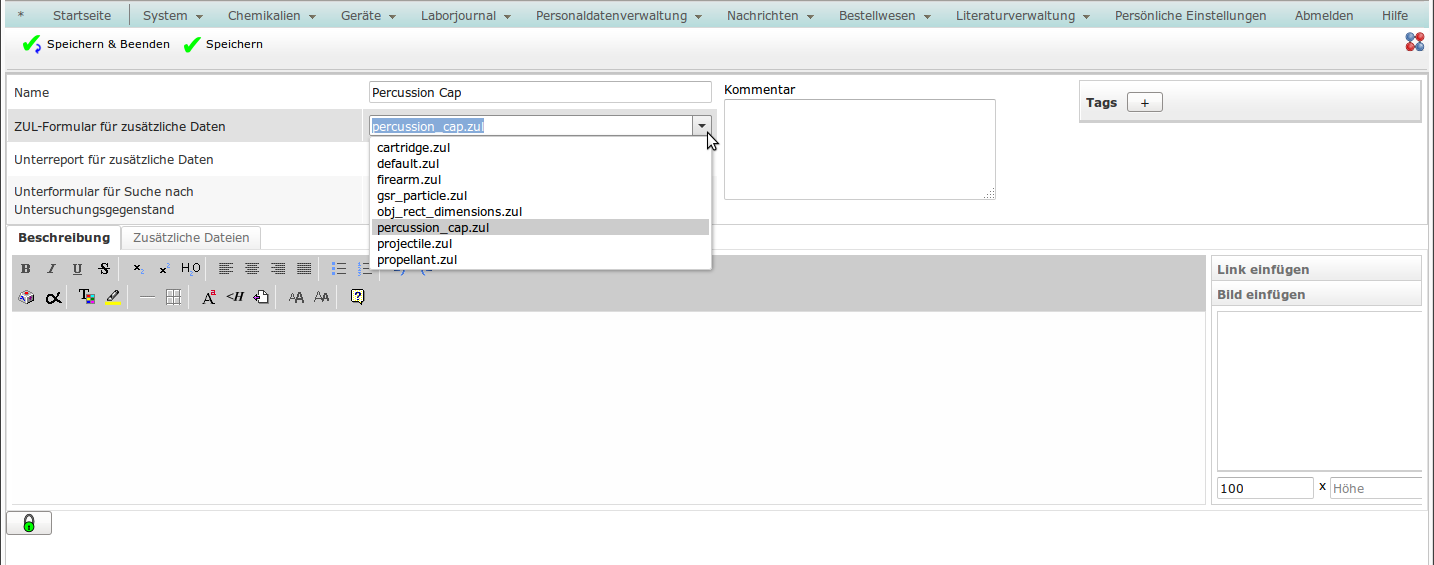 Geben Sie im Formular den Namen des Objekttyps und eine Beschreibung ein. Über das Feld "ZUL-Datei für zusätzliche Daten" können Sie ein Unterformular definieren, in dem weitere Eigenschaften der einzelnen Untersuchungsgegenstände erfaßt werden können. Enter the object type name and a description. The "ZUL form for additional data" allows to define a sub-form, where additional properties can be documented.