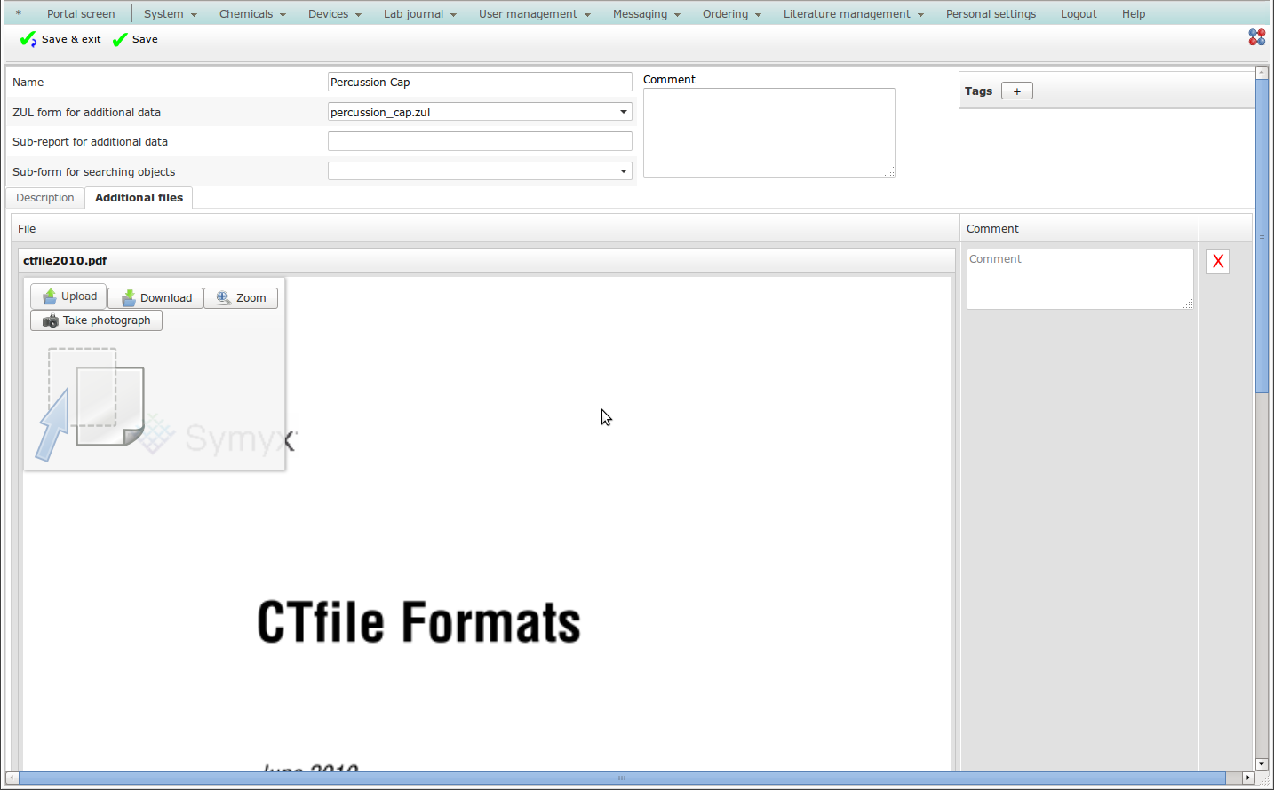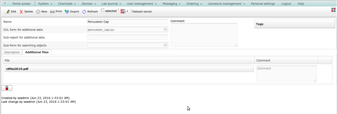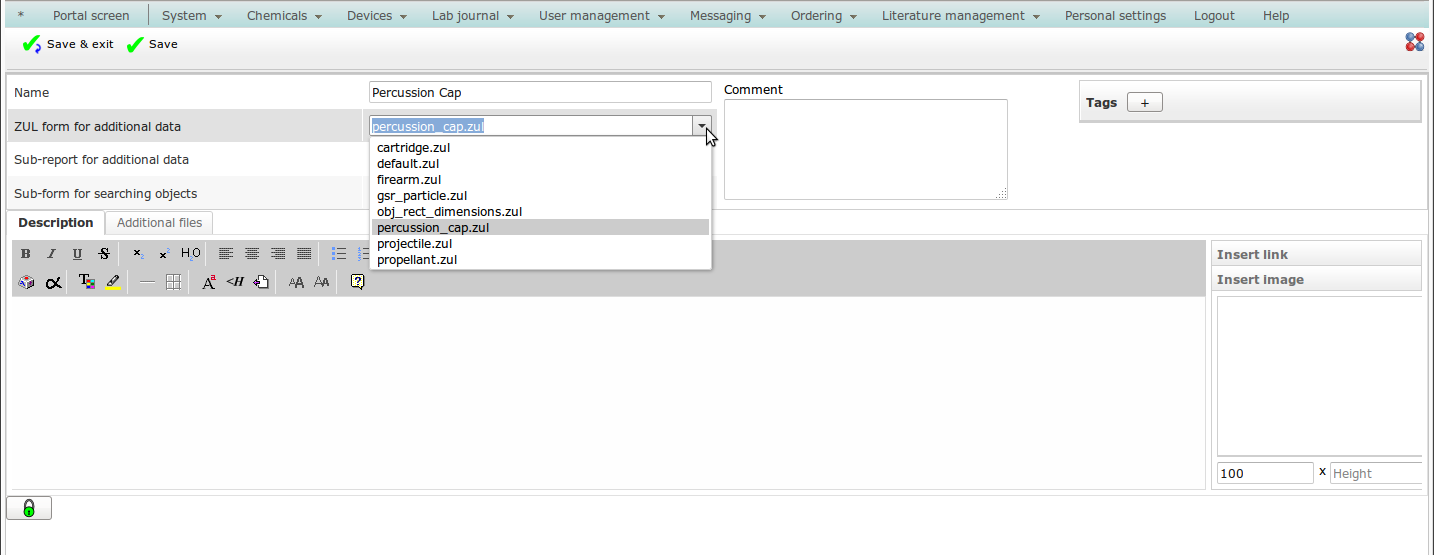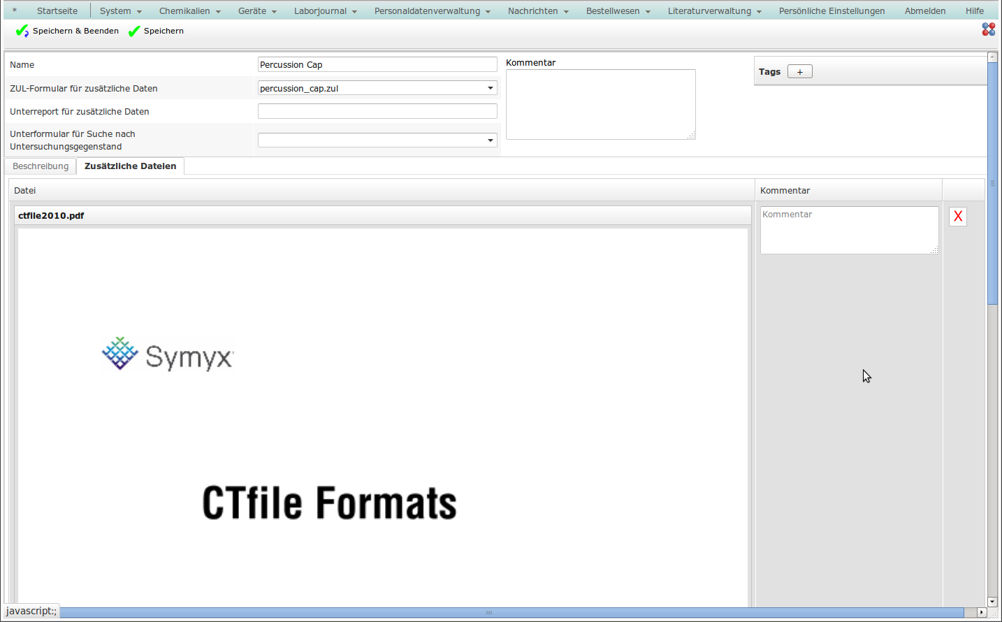Geben Sie im Formular den Namen des Objekttyps und eine Beschreibung ein. Über das Feld "ZUL-Datei für zusätzliche Daten" können Sie ein Unterformular definieren, in dem weitere Eigenschaften der einzelnen Untersuchungsgegenstände erfaßt werden können. Enter the object type name and a description. The "ZUL form for additional data" allows to define a sub-form, where additional properties can be documented.