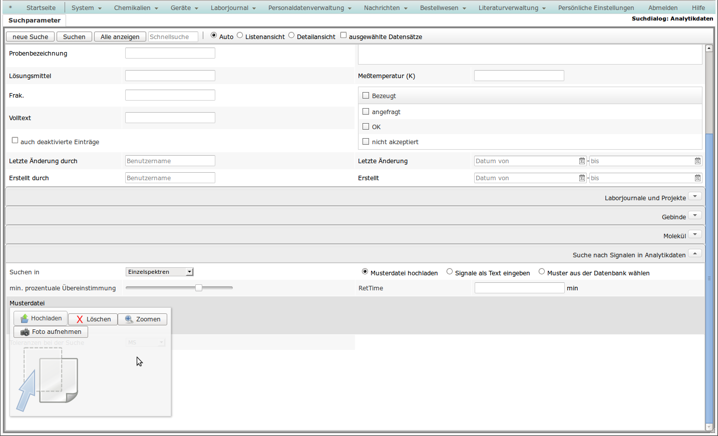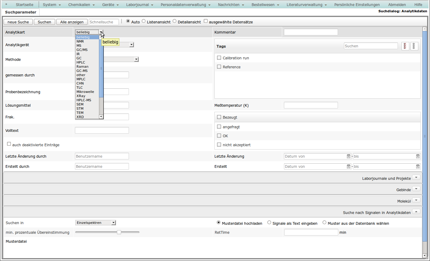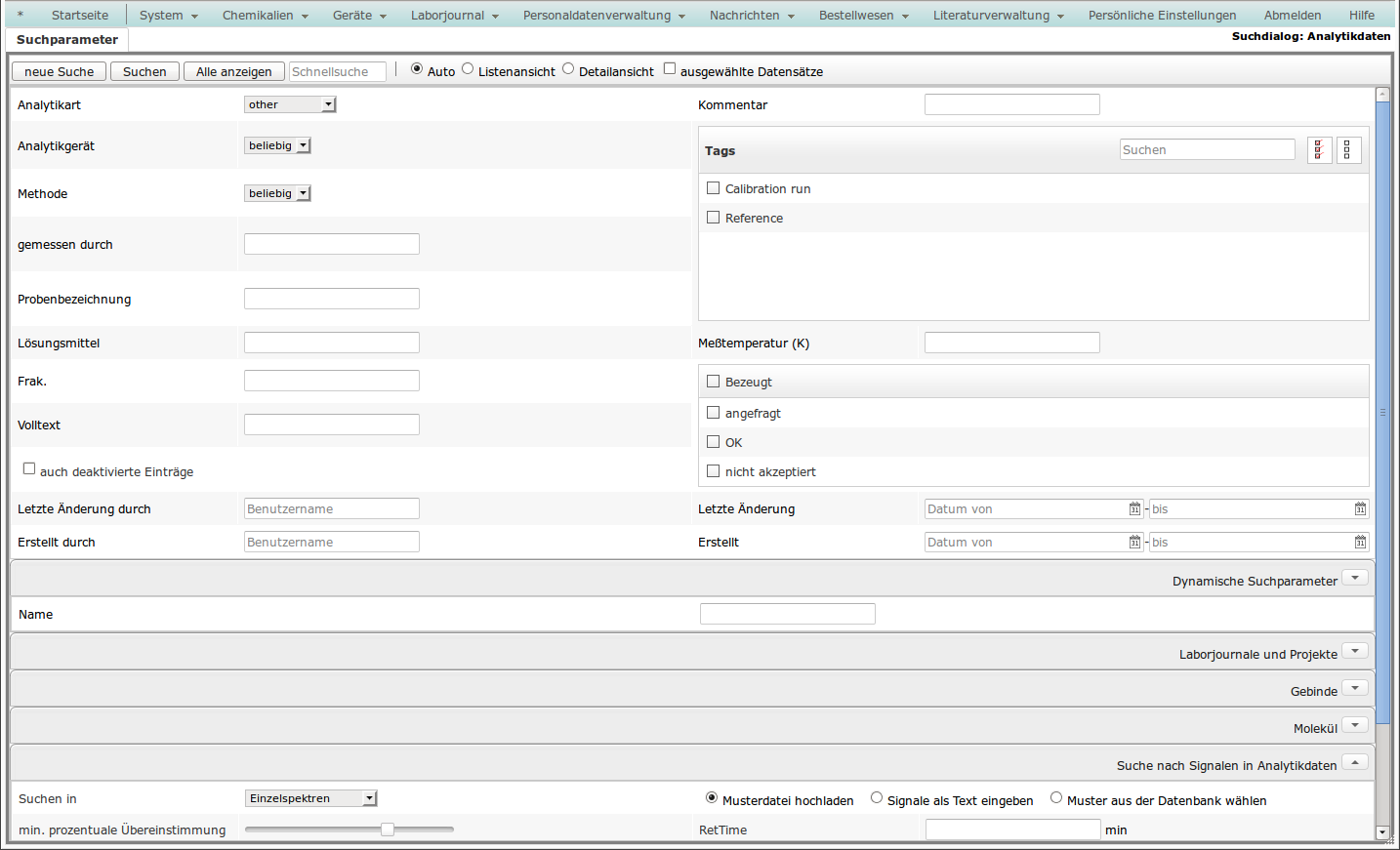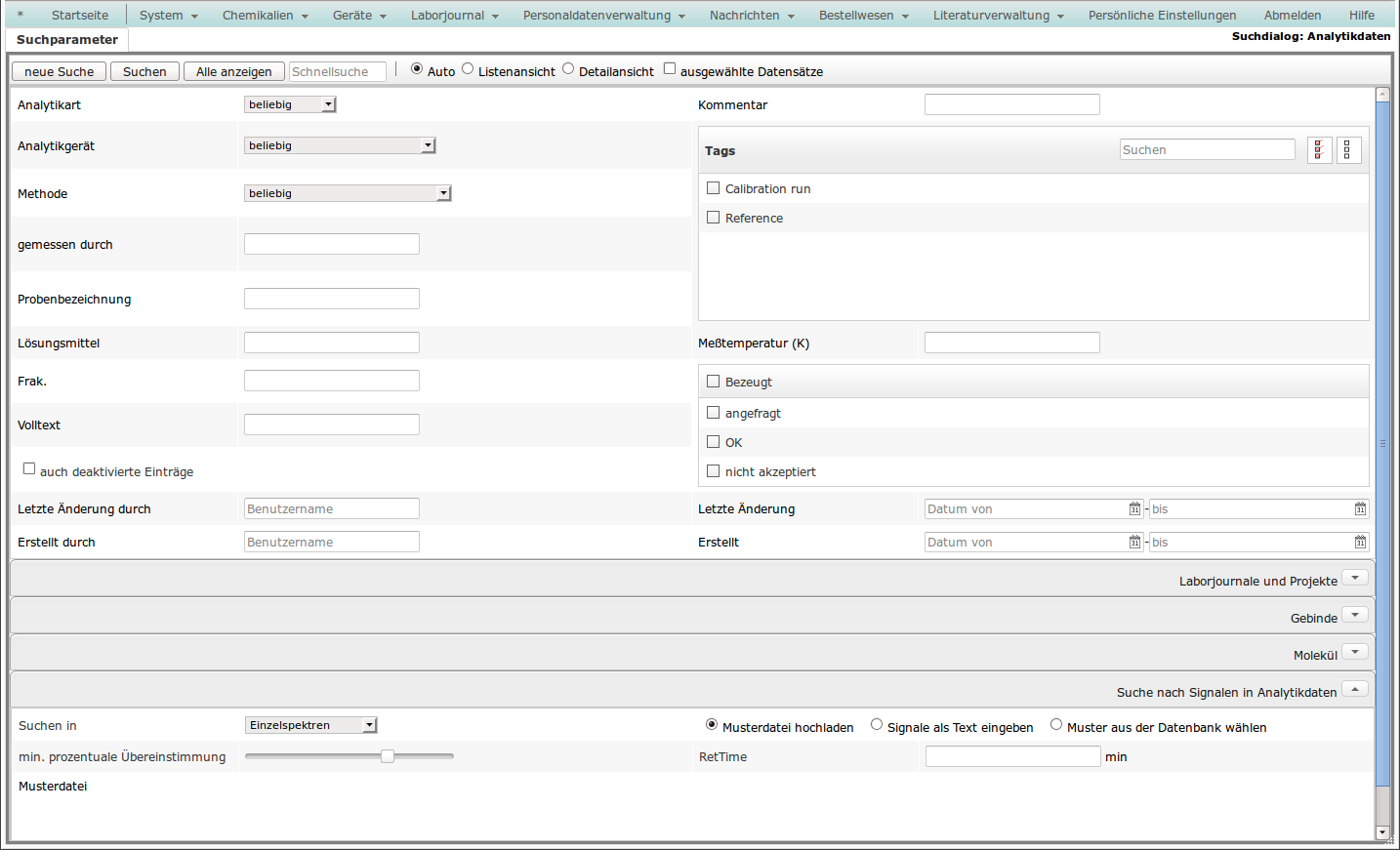 Zum Suchen von Analytikdaten wählen Sie "Laborjournal > Analytikdaten suchen".