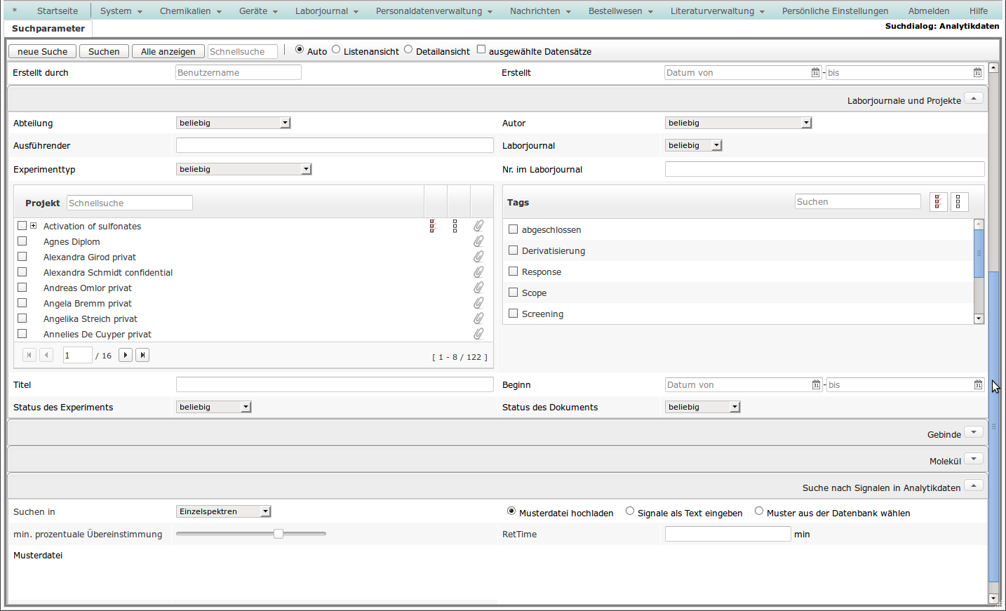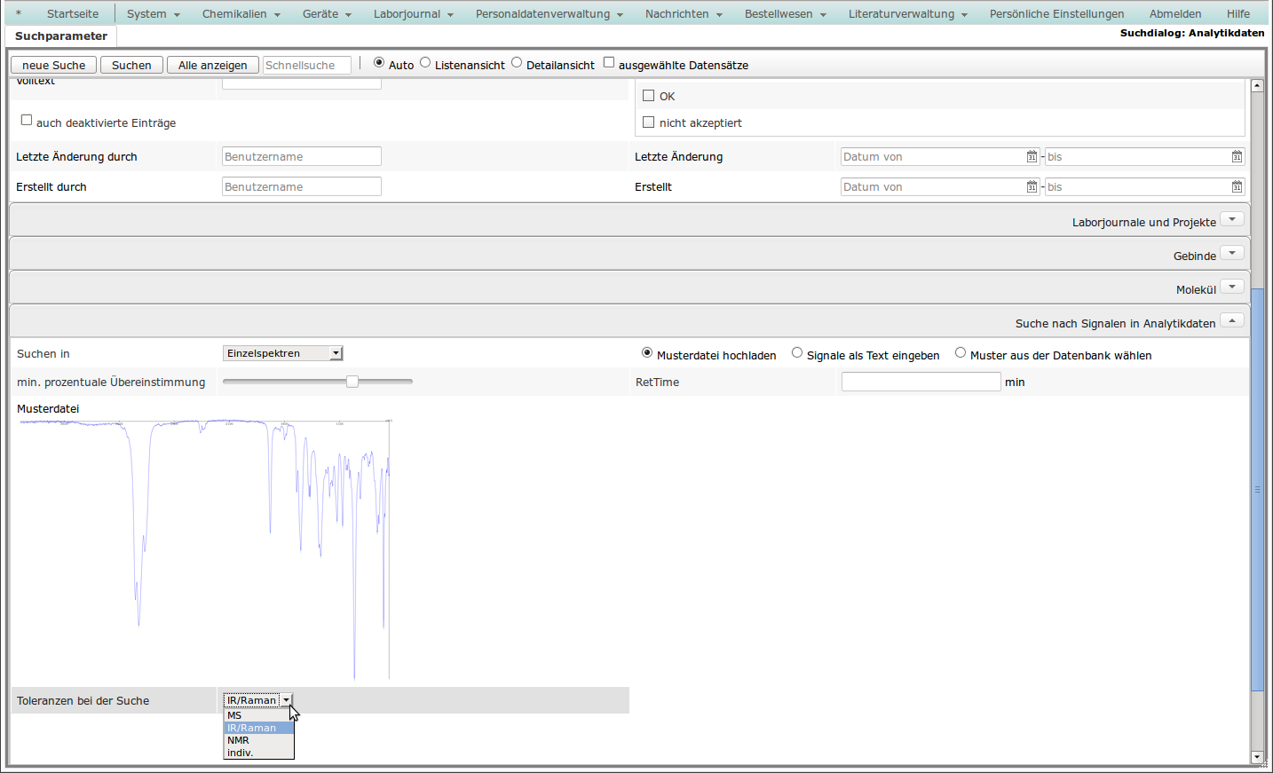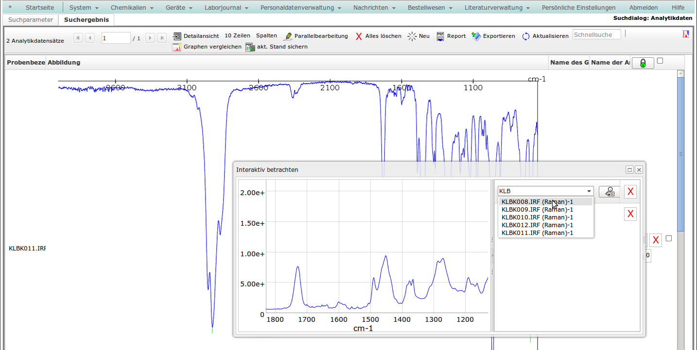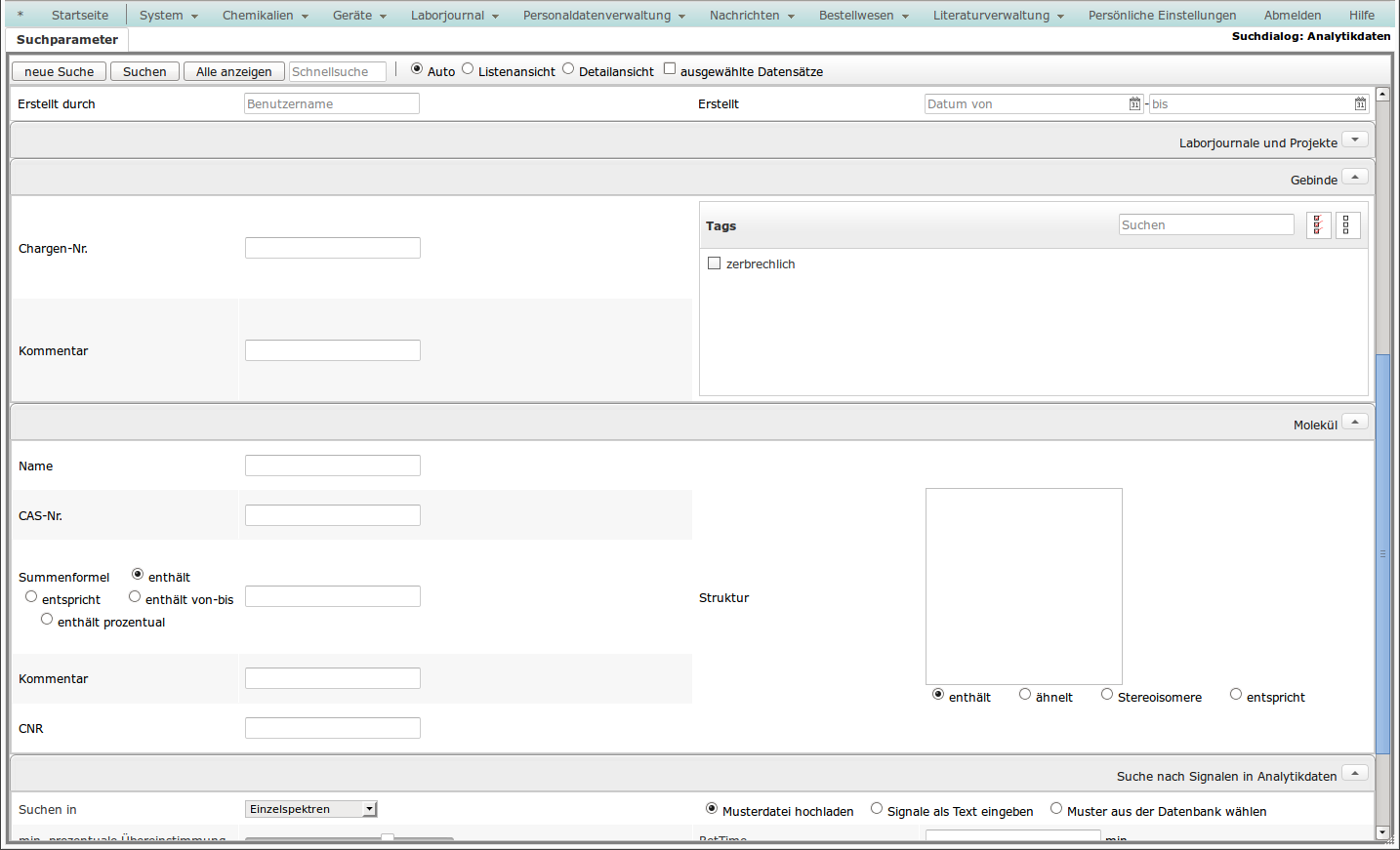 Zum Suchen von Analytikdaten wählen Sie "Laborjournal > Analytikdaten suchen".
