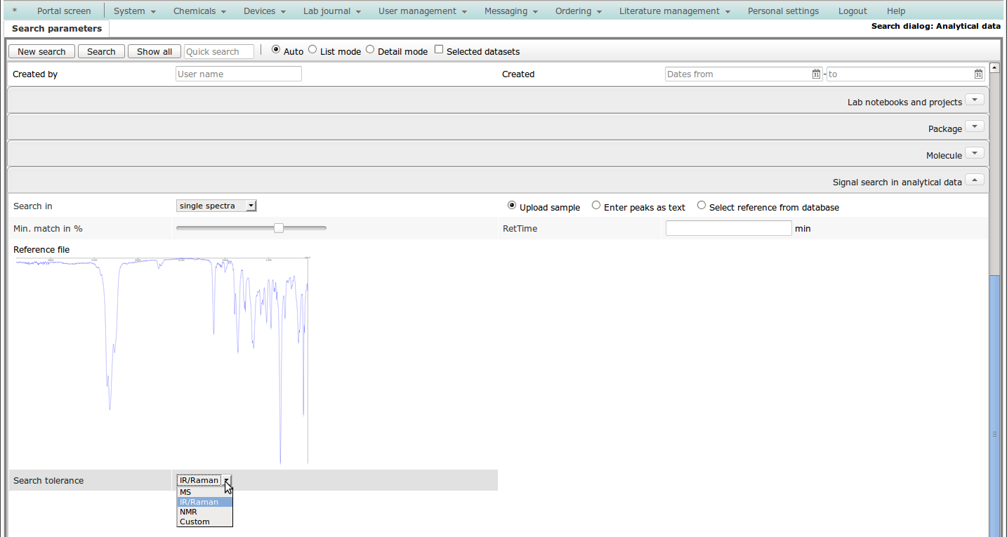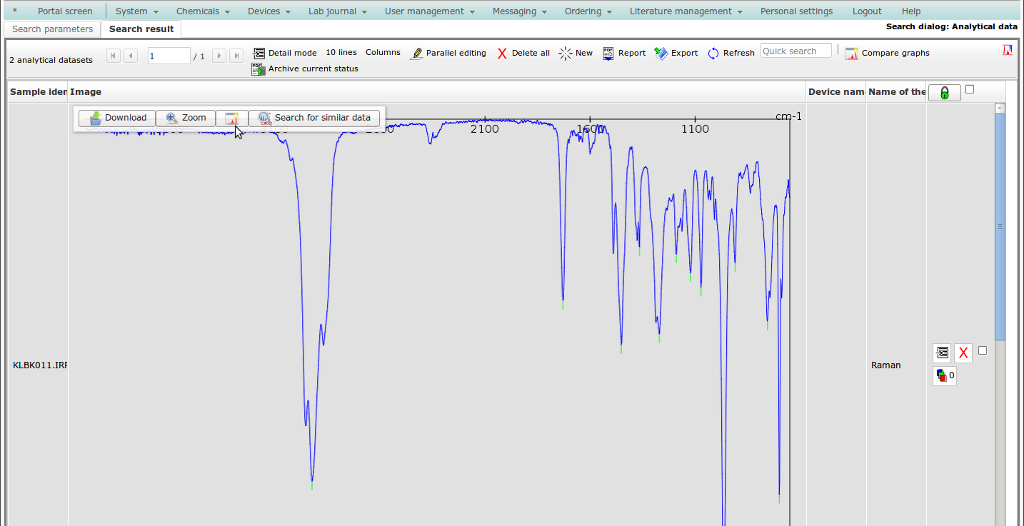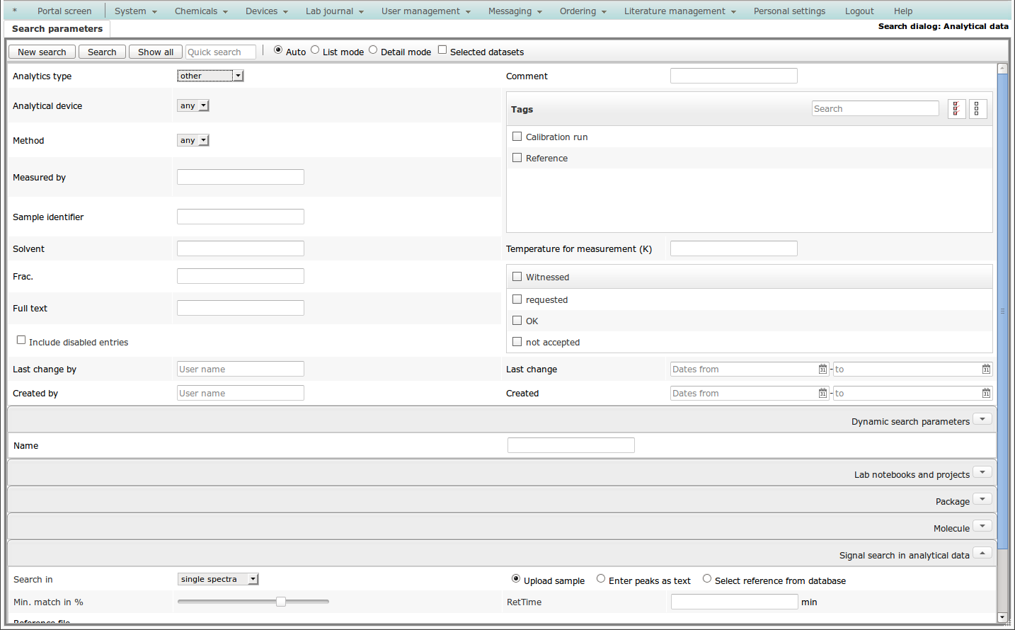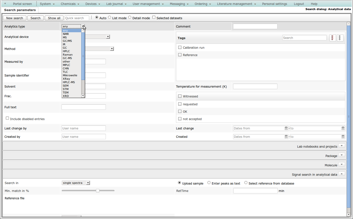 To search for analytical data, choose "ELN > Search analytical data" from the menu.