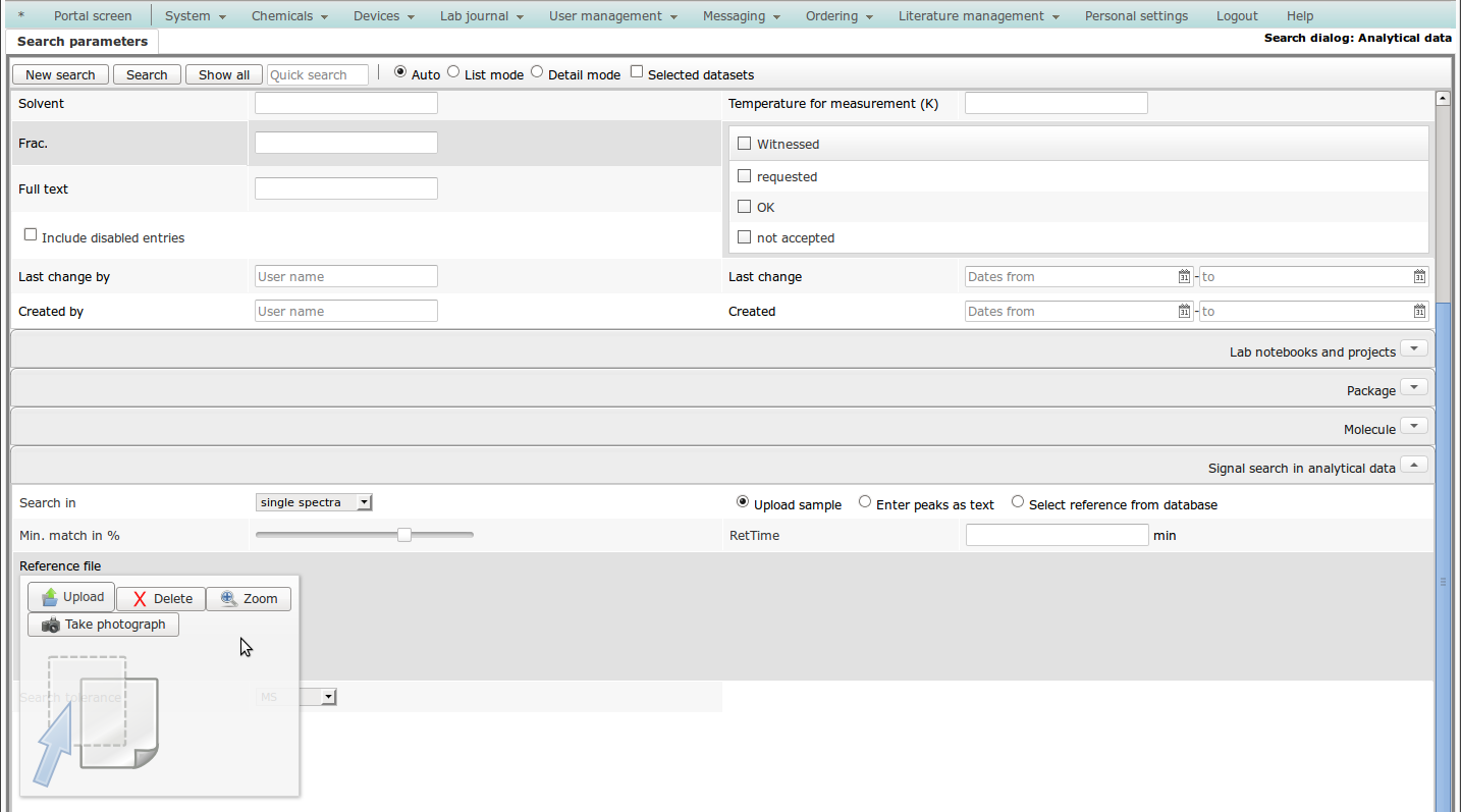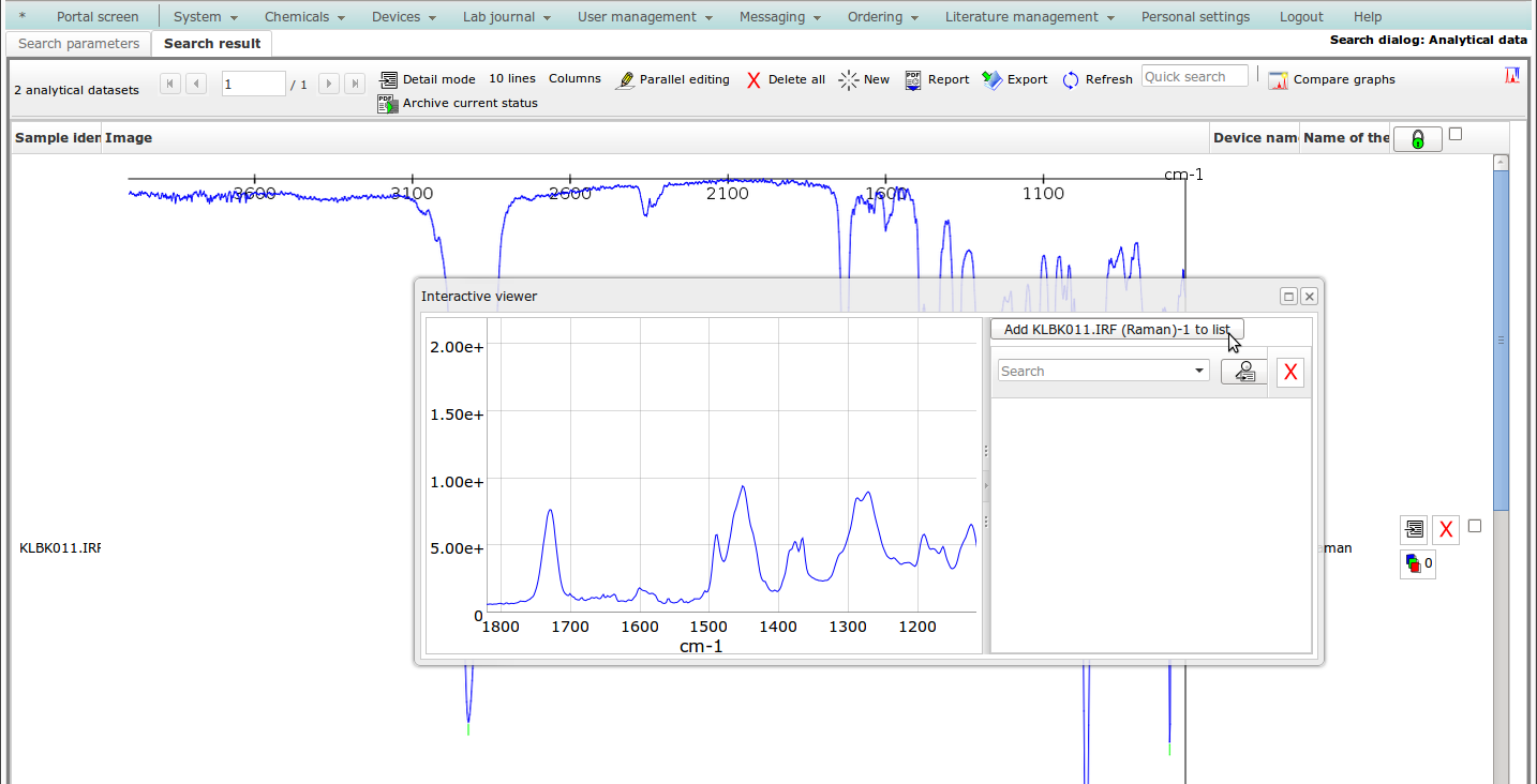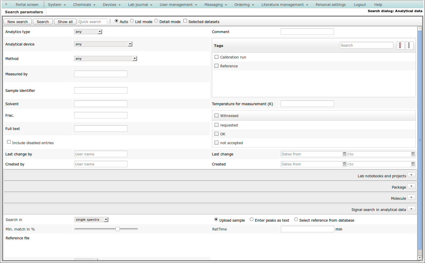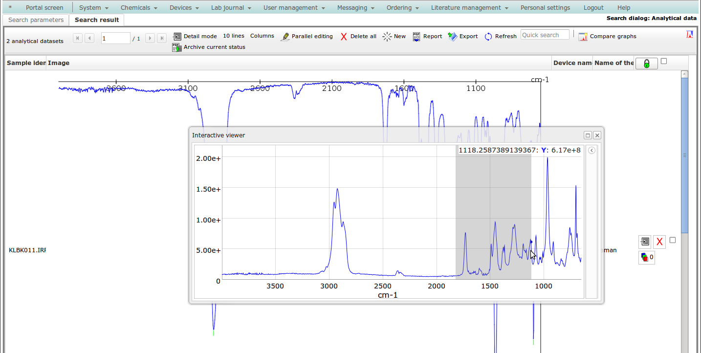 To search for analytical data, choose "ELN > Search analytical data" from the menu.