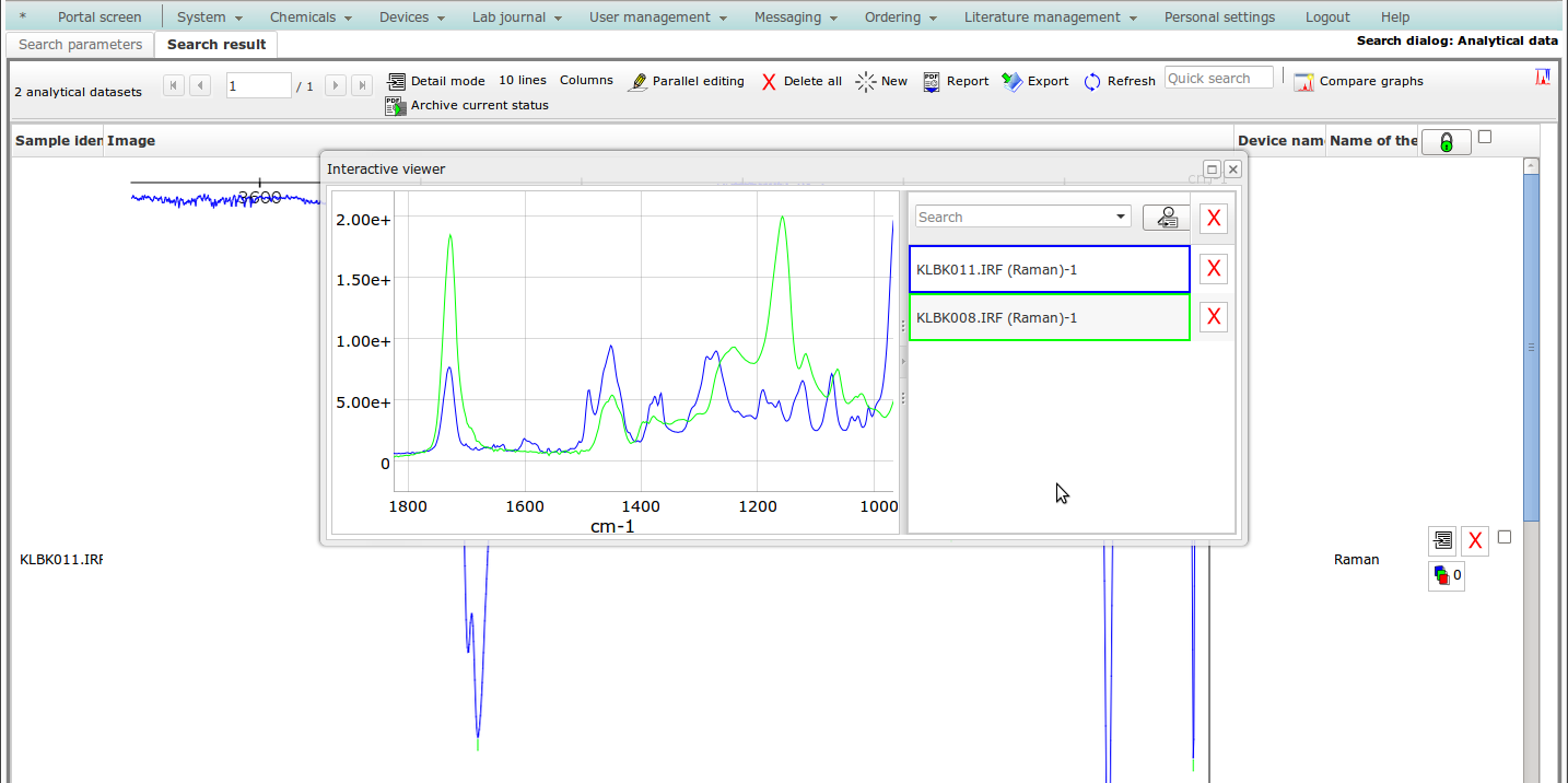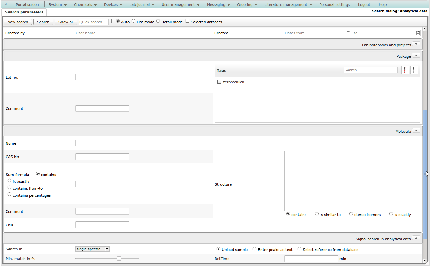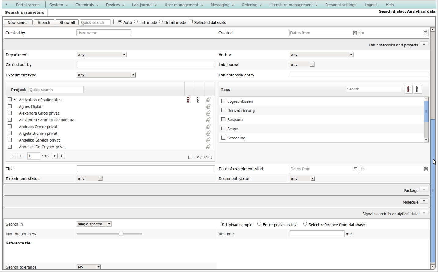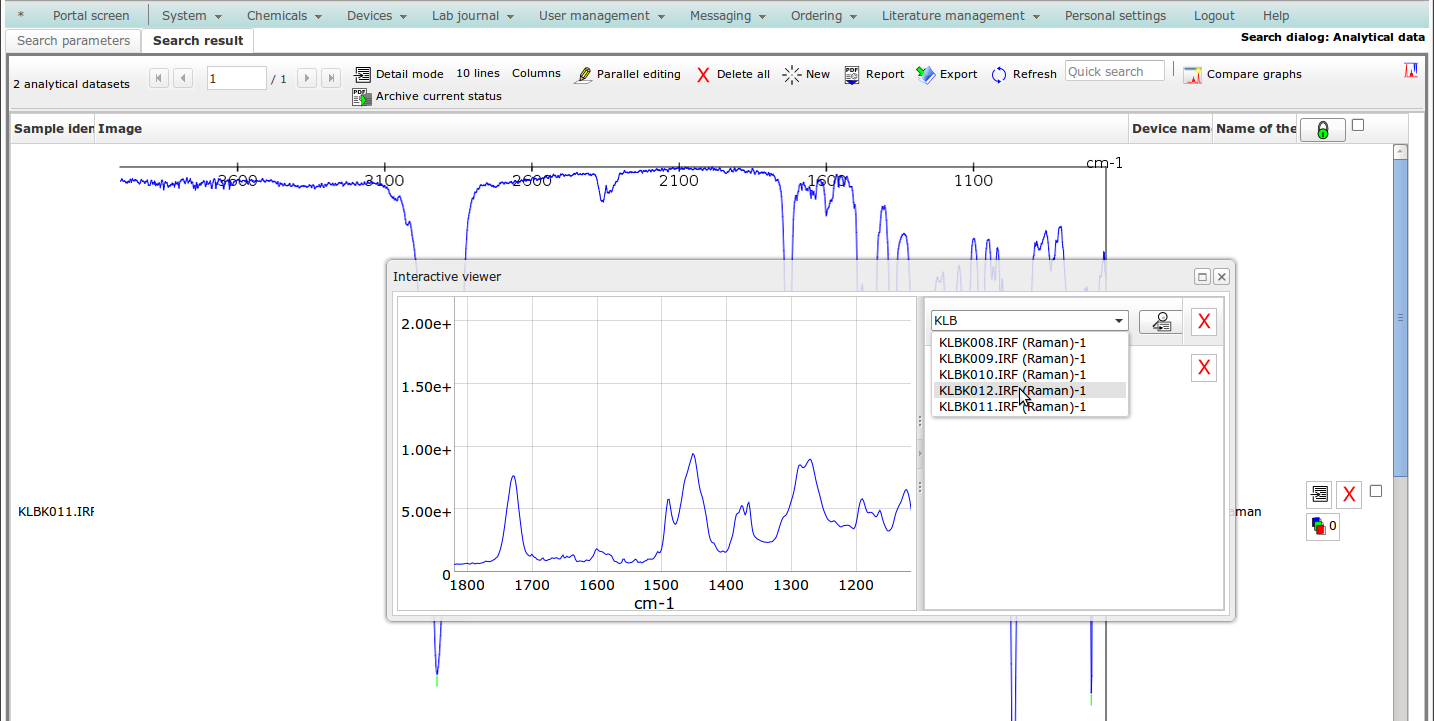 To search for analytical data, choose "ELN > Search analytical data" from the menu.