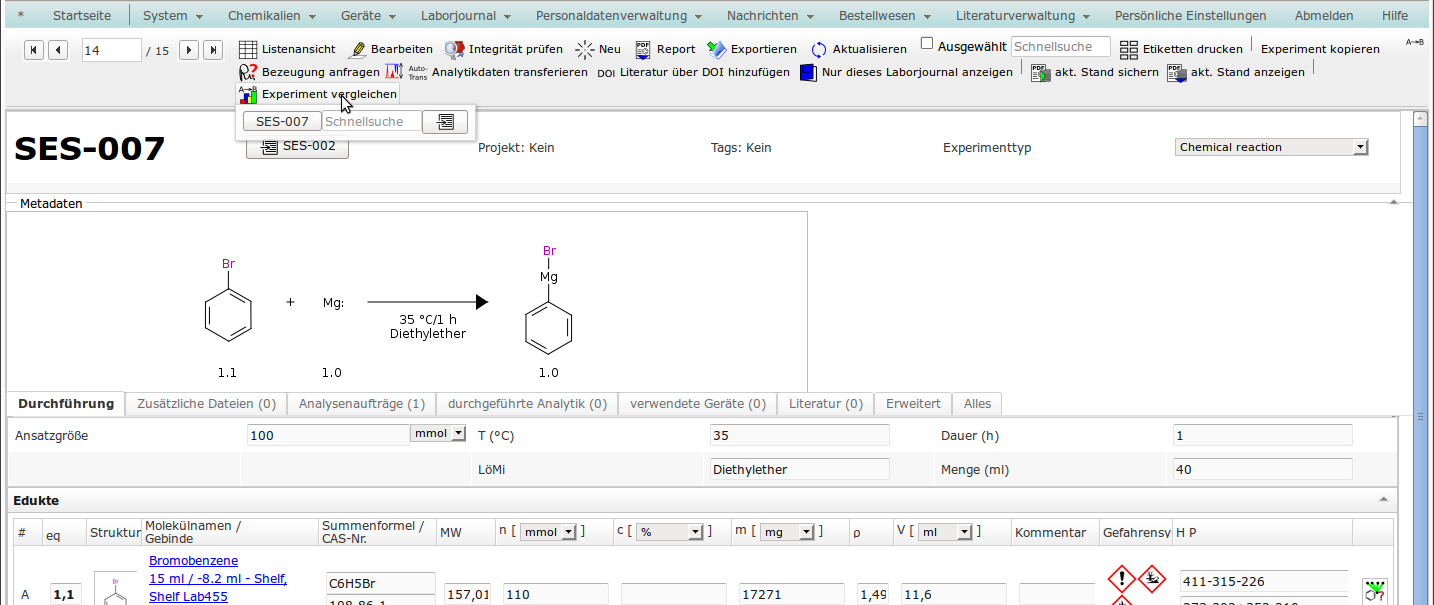 - Sie können alle Experimente einer Person, eines Laborjournals, eines Projekts oder eines bestimmten Experimenttyps auflisten lassen. You can search all experiments belonging to a person, a lab notebook or a project, the ones using a specific template.
