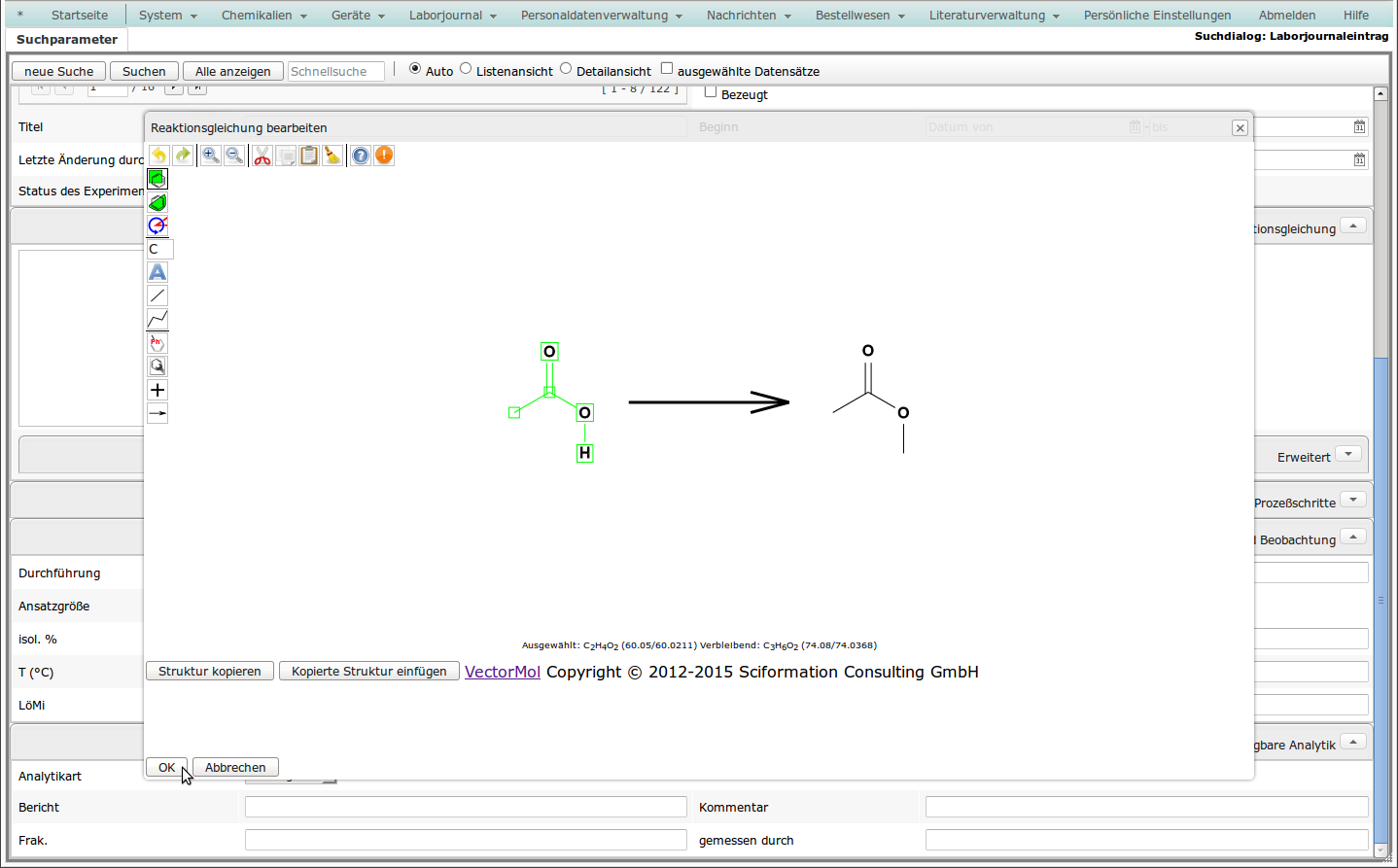 - Sie können nach (Teilen) einer Reaktionsgleichung suchen. Unter "Erweitert" stehen zusätzliche Möglichkeiten zur Verfügung, um die Anfrage bezüglich einzelner Komponenten zu präzisieren. You can search for (parts of) a reaction equation. In the section "Extended", you can further specify the conditions for components of the experiment.
