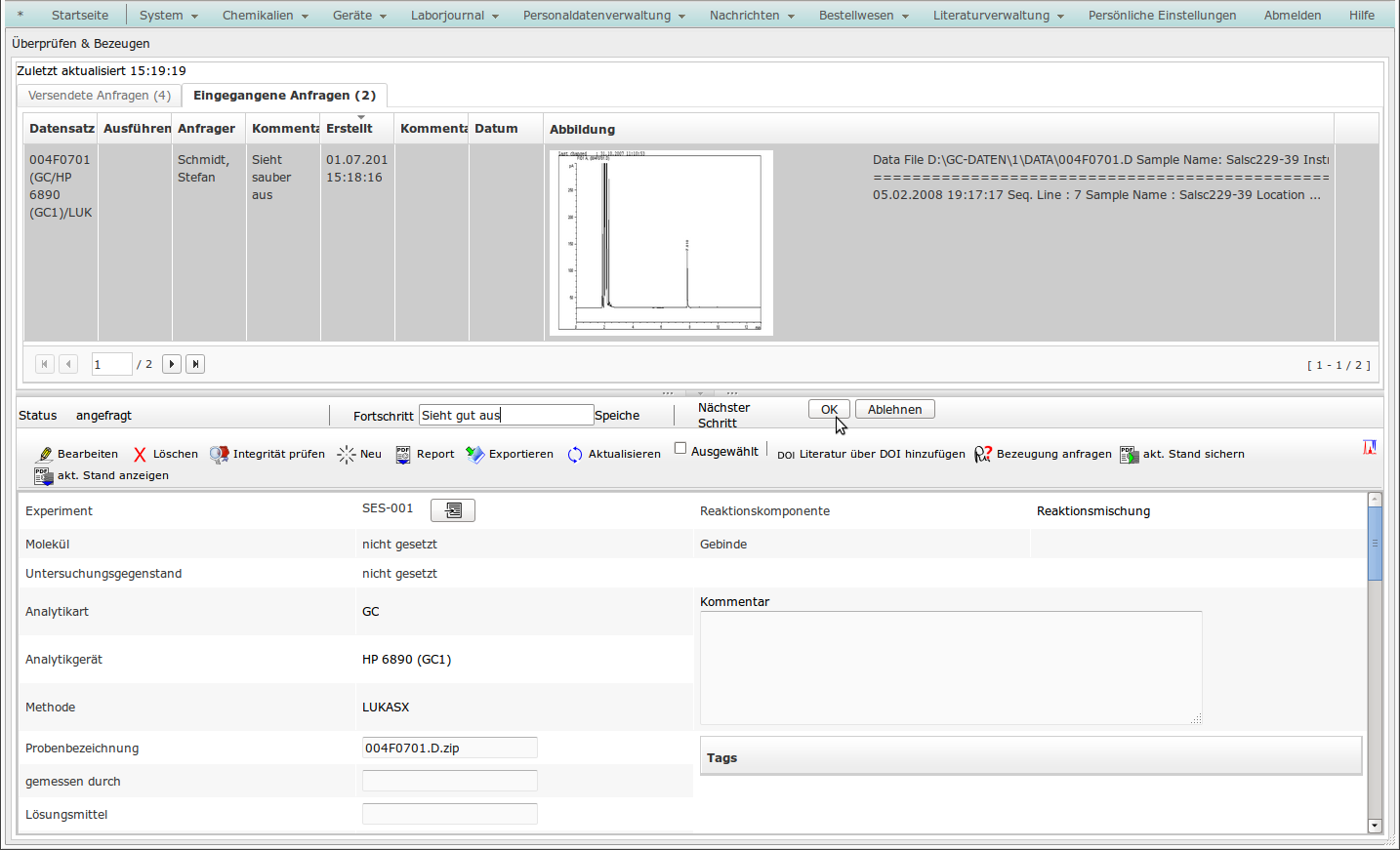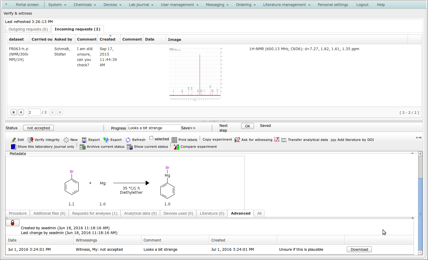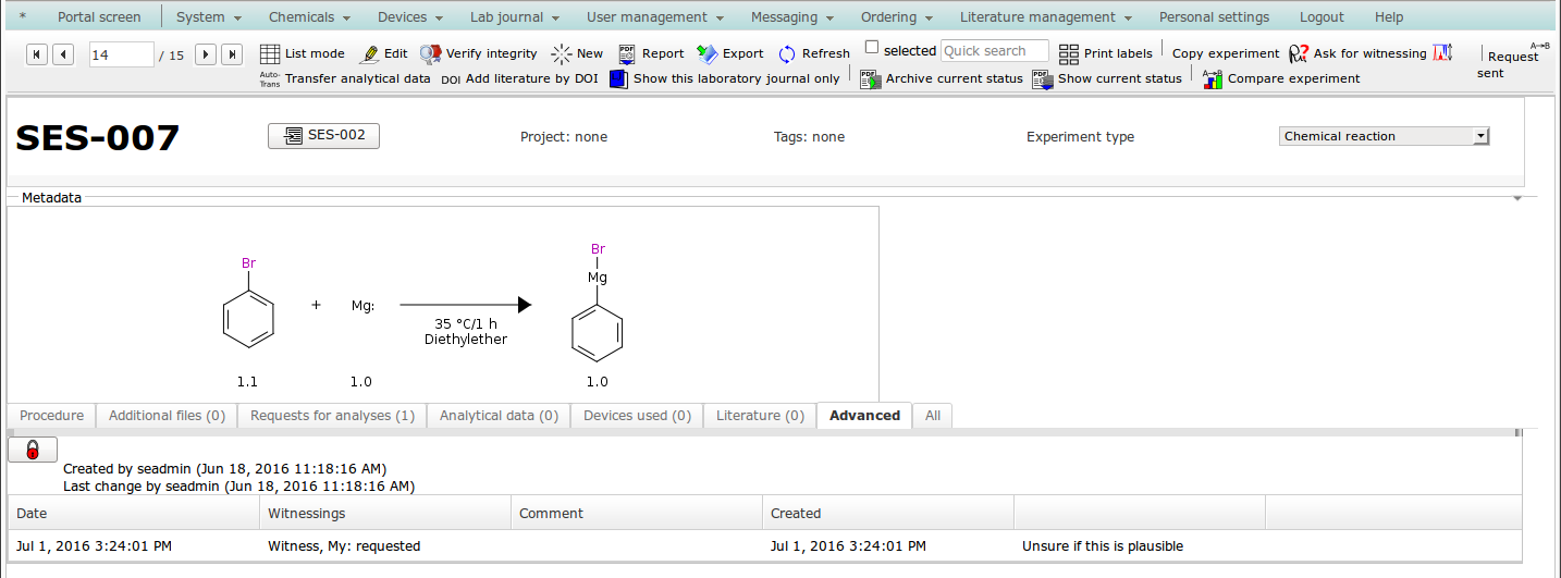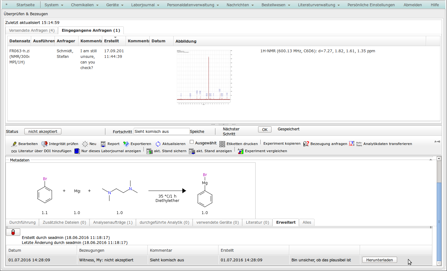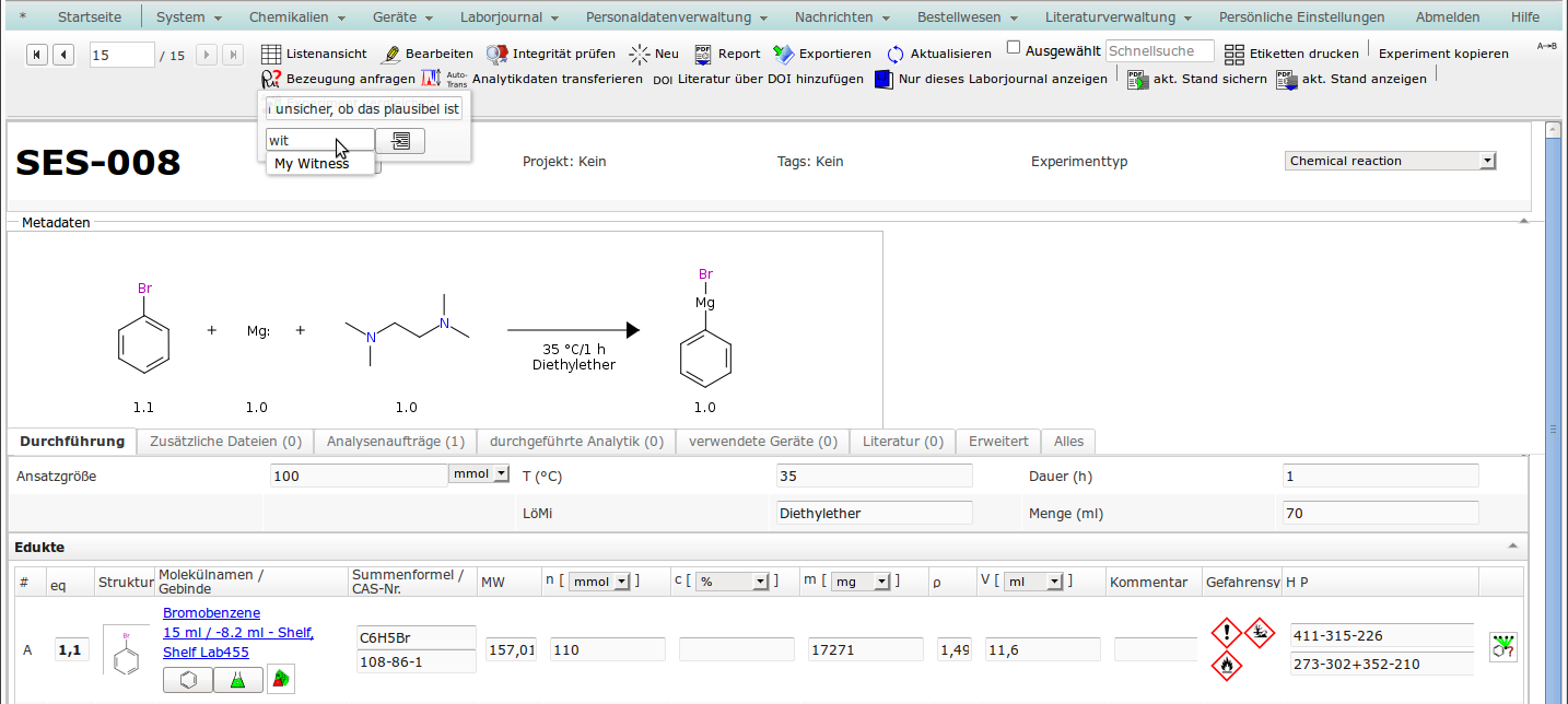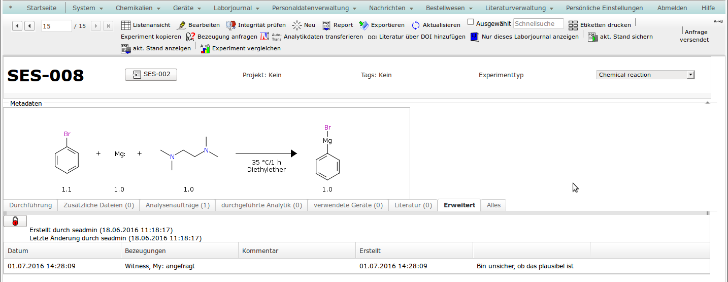 Abhängig von gesetzlichen oder unternehmensinternen Regularien kann es nötig sein, die Ergebnisse eines Experiments oder einer Messung durch einen sachkundigen Dritten unabhängig bestätigen zu lassen.Depending on legal or corporate regulations, it may be necessary to confirm the outcome of experiments or measurements by in independent expert.Um die Bezeugung eines Laborjournaleintrags anzufragen, öffnen Sie den betreffenden Datensatz in der Detailansicht und überstreichen Sie in der Symbolleiste "Bezeugung anfragen".