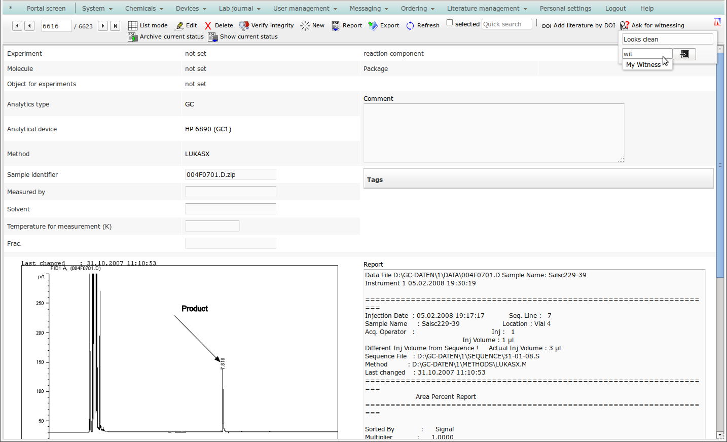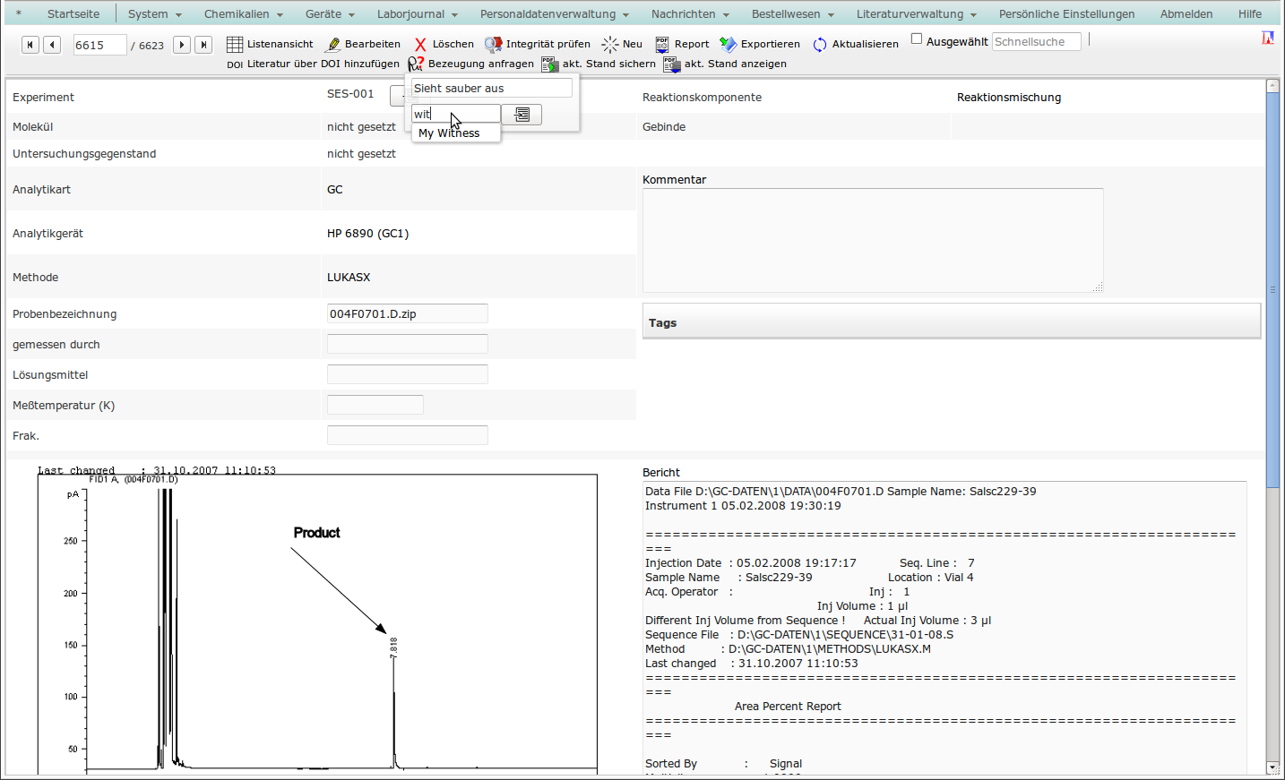 Analog dazu verläuft die Bezeugung von Analytikdaten: überstreichen Sie in der Symbolleiste "Bezeugung anfragen", wählen Sie den betreffenden Kollegen und tragen Sie ggf. einen Kommentar ein.In the same way, you can ask a colleague to witness analytical data: hover "Ask for witnessing" in the toolbar, select the other user and enter a comment if required.