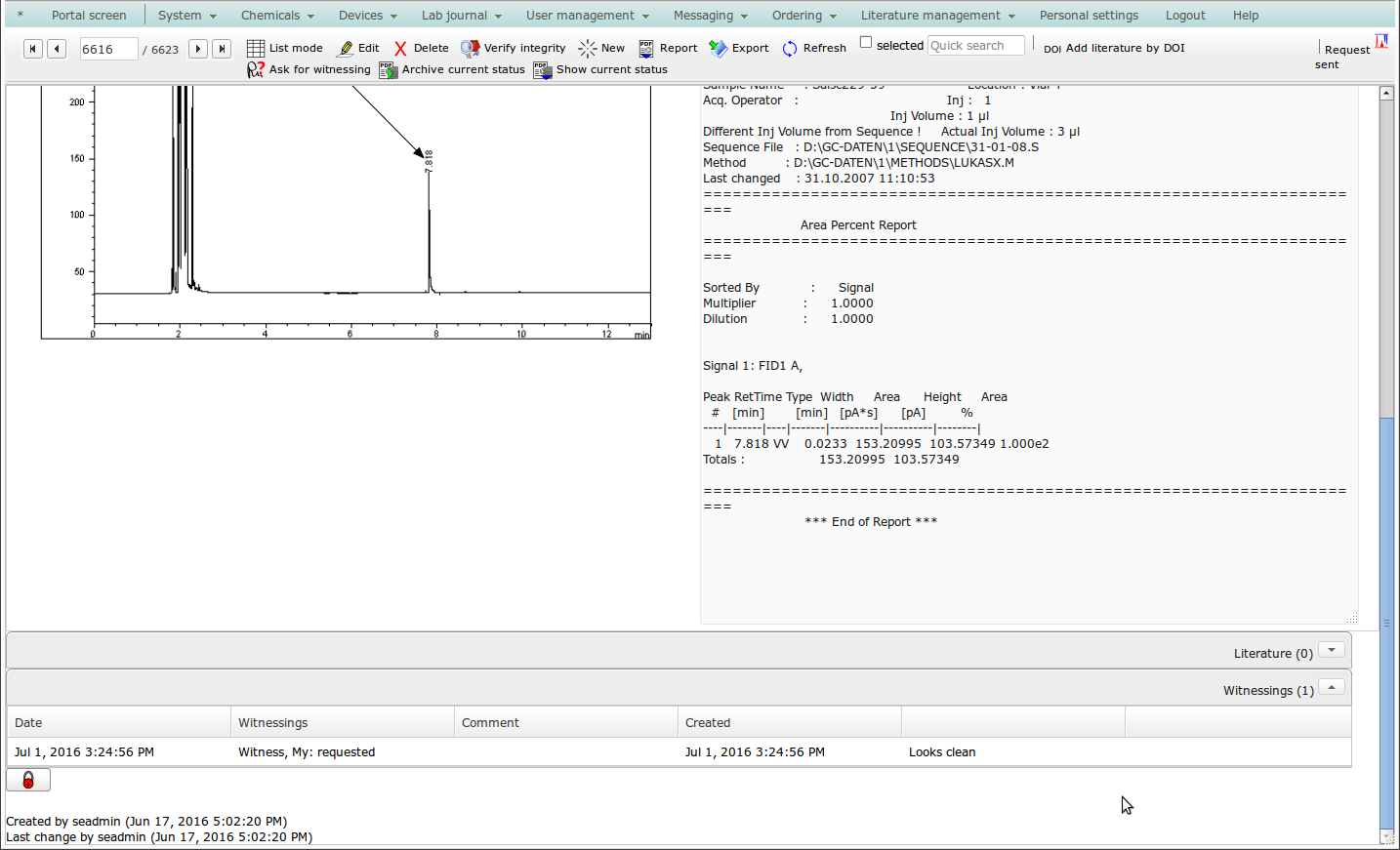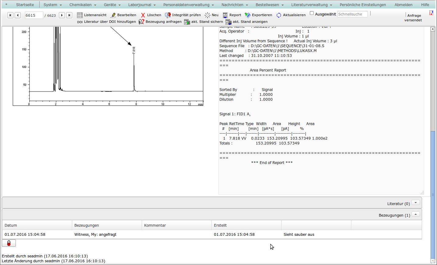 Der Status ist bei Analytikdaten in der "Bezeugungen"-Box unten im Formular sichtbar, wo nun auch das archivierte PDF abgerufen werden kann.For analytical data, the status is tracked in the "Witnessings" box at the bottom of the form, where the archived PDF can be downloaded at this stage.