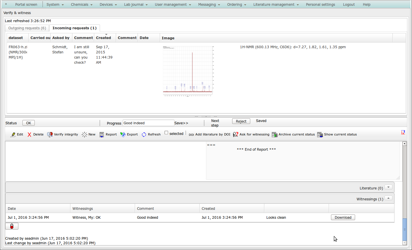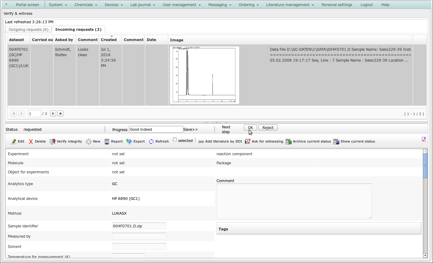 Der gewählte Zeuge kann die Anfragen über den Menüpunkt "Laborjournal > Überprüfen & Bezeugen" aufrufen.The selected witness can open the list of requests through the menu item "ELN > Verify & witness".