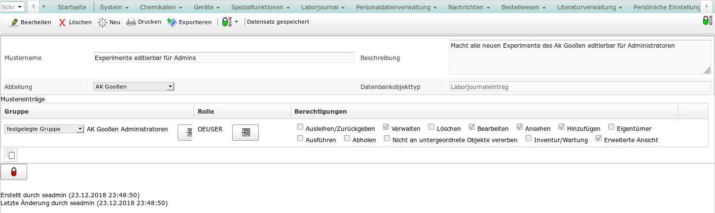• Über ACL bearbeiten stellen Sie ein, wer dieses Berechtigungsmuster nutzen darf. Via Edit ACL you can control who will be able to use the pattern.