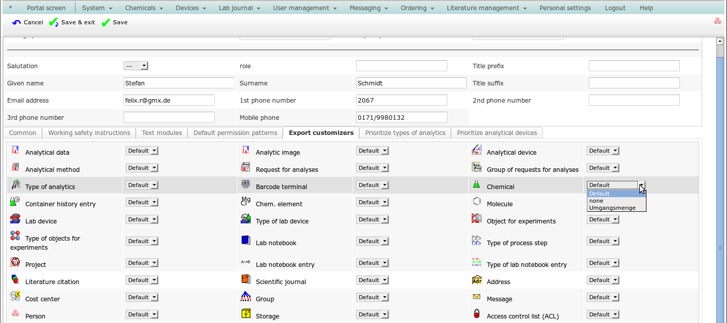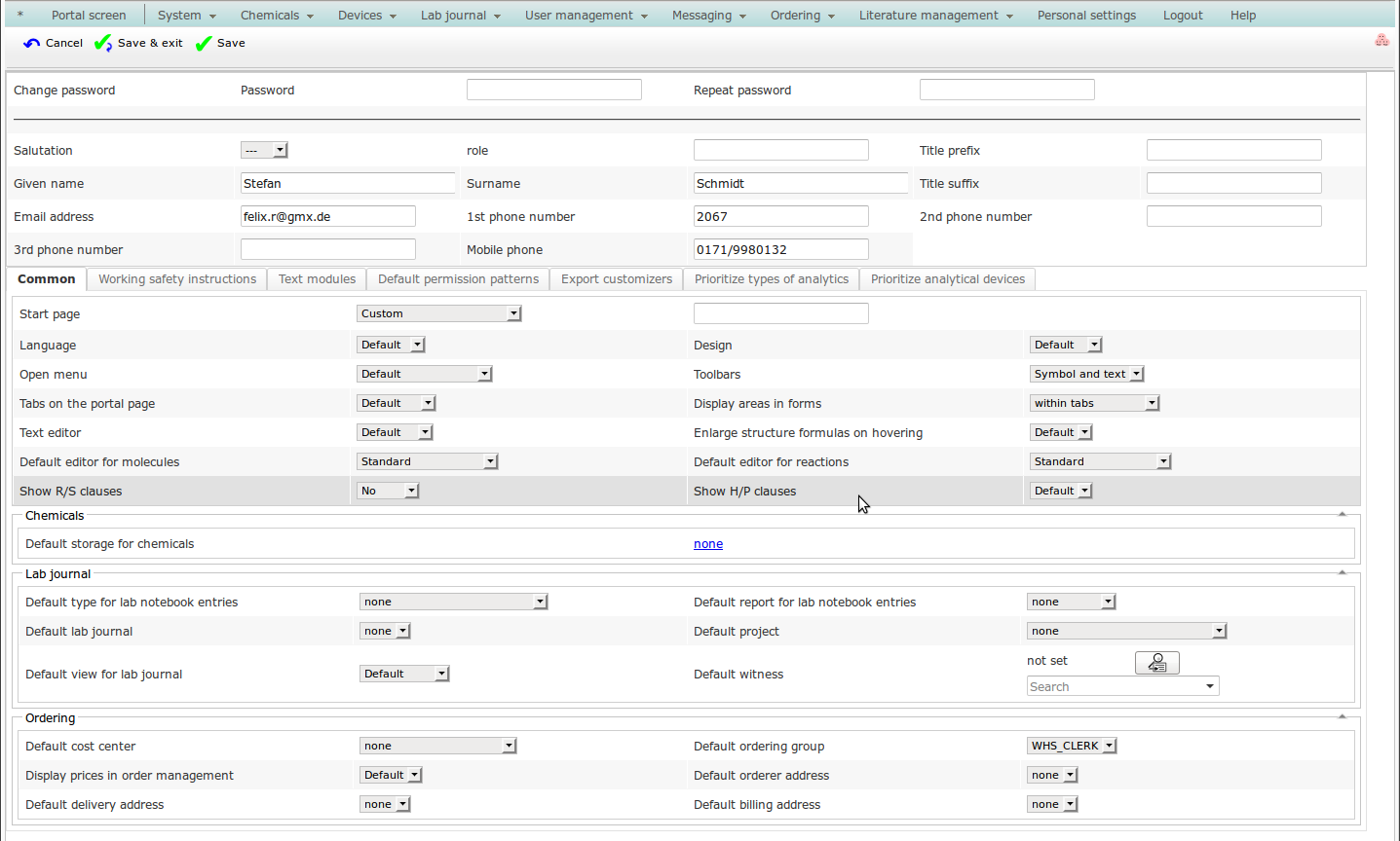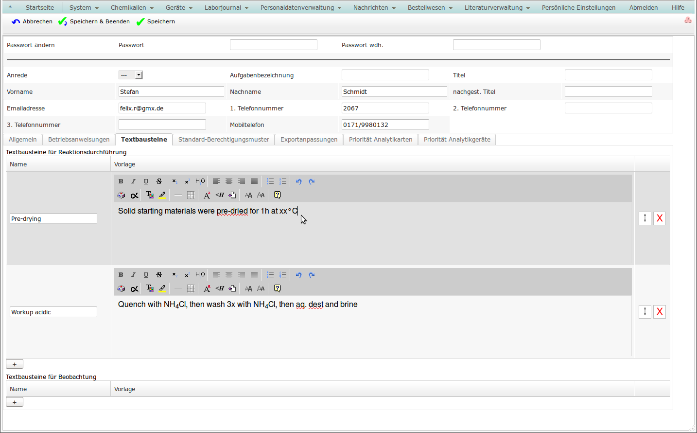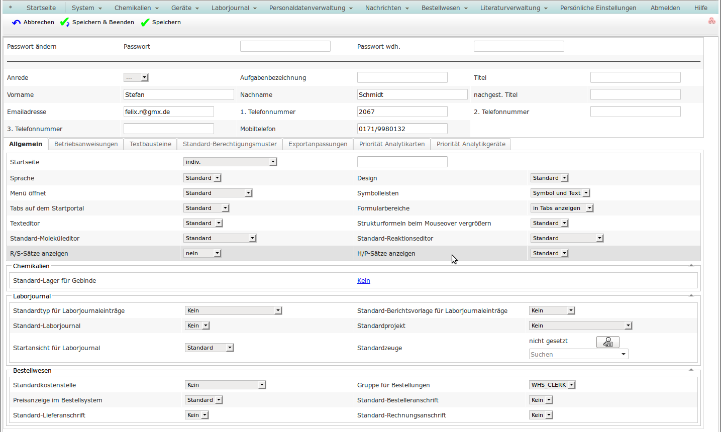 Über den Menüpunkt "Persönliche Einstellungen" können Sie Sciformation ELN an Ihre Erfordernisse anpassen. Im oberen Formularteil können Sie Ihr Kennwort ändern sowie unter Umständen Ihre persönlichen Daten wie Name oder Telefonnummer pflegen.