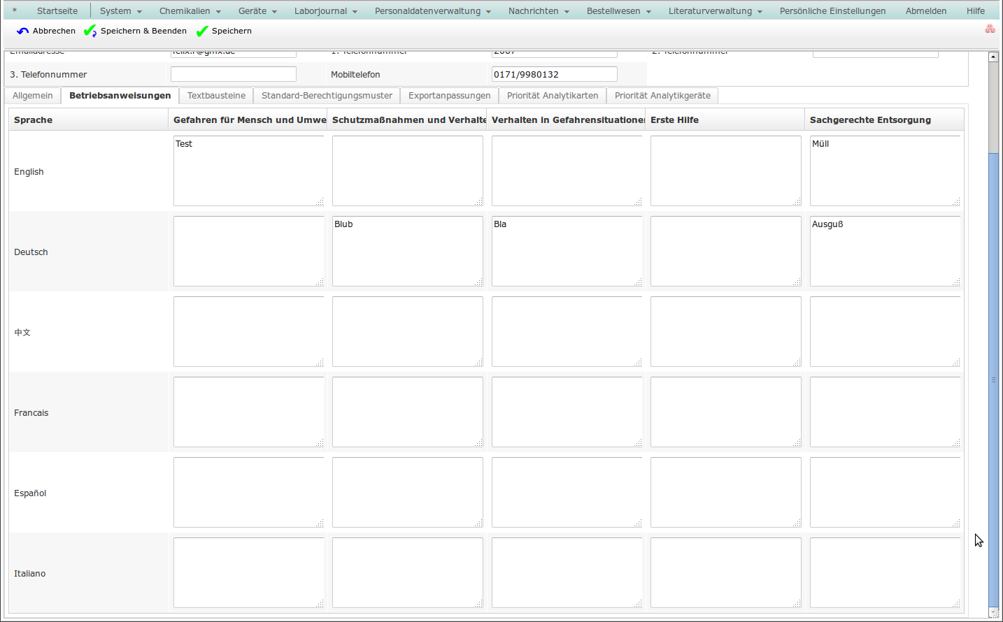 Vorgabetexte für Betriebsanweisungen in unterschiedlichen Sprachen