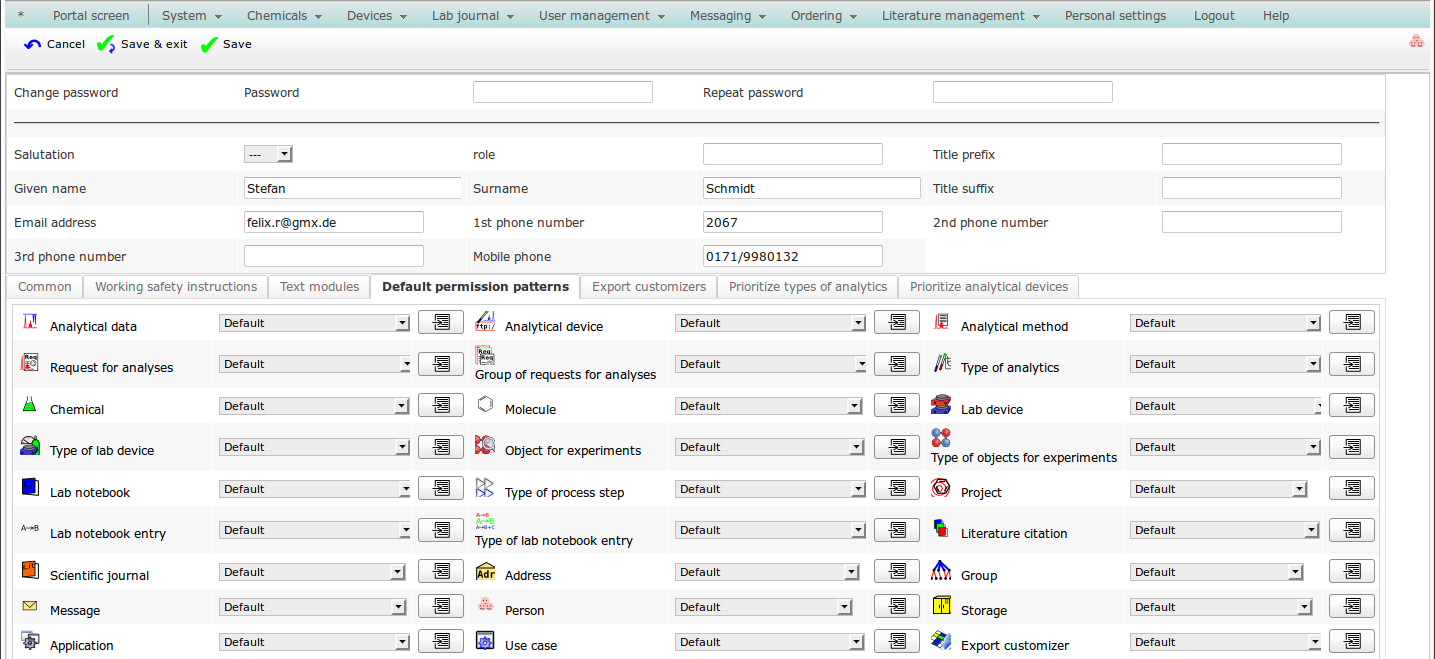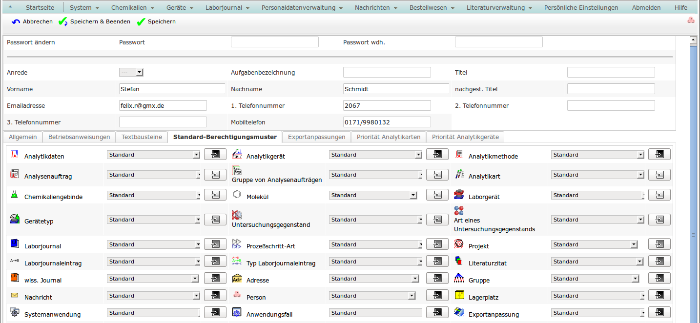 werden angewendet, wenn Sie ein neues Datenbankobjekt (Substanz, Laborjournaleintrag,...) erstellen, ohne explizit andere Berechtigungen zu vergeben.