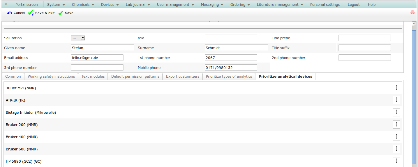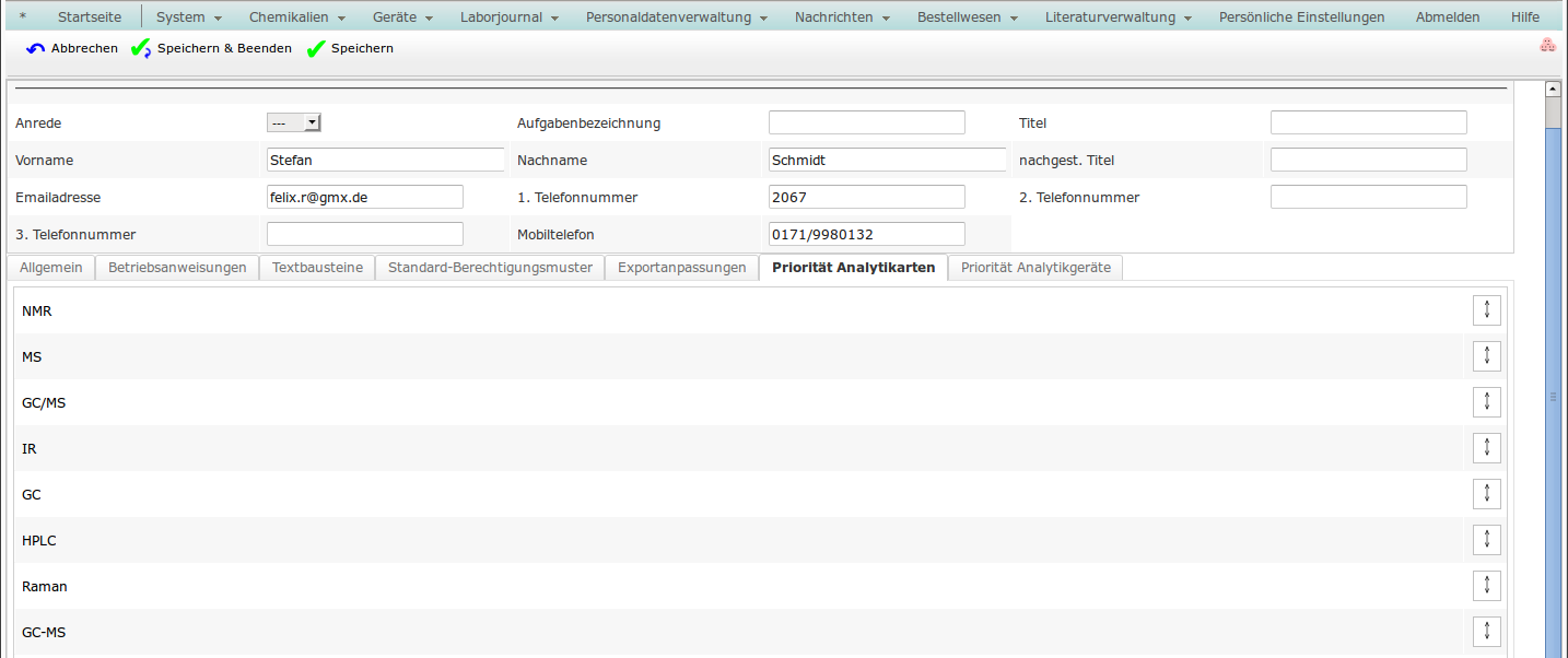 In den Tabs "Priorität Analytikarten" bzw. "Priorität Analytikgeräte" können Benutzer eigene Reihenfolgen für die betreffenden Einträge vornehmen, z.B. um häufig genutzte Einträge leichter zu erreichen.