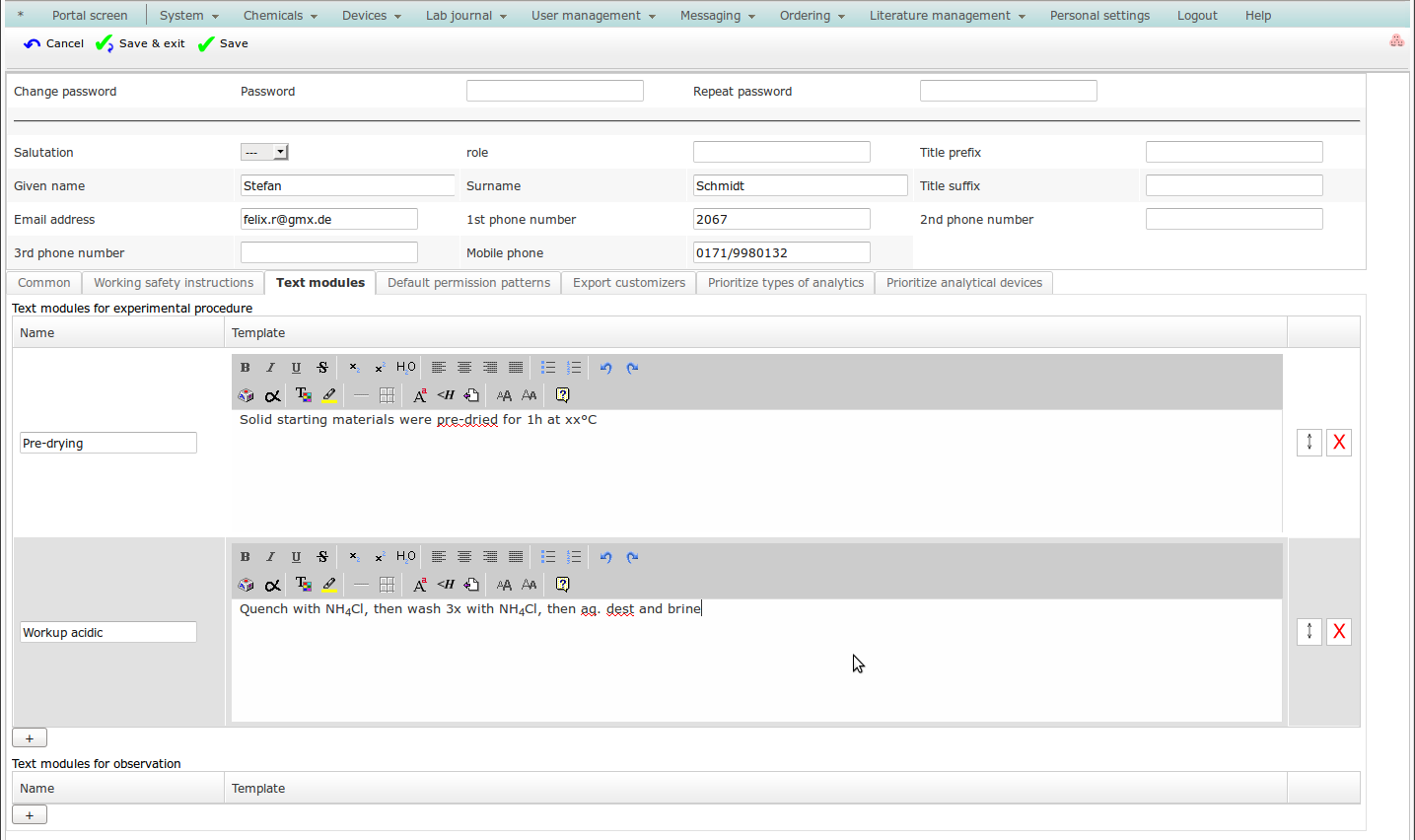 Via the menu item "Personal settings", you can adapt Sciformation ELN to your requirements. In the upper part of the form, you can change your password and you may be able the update personal data like name or phone number.