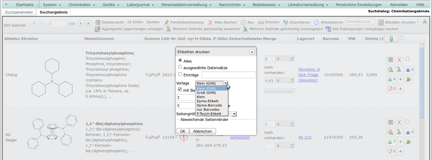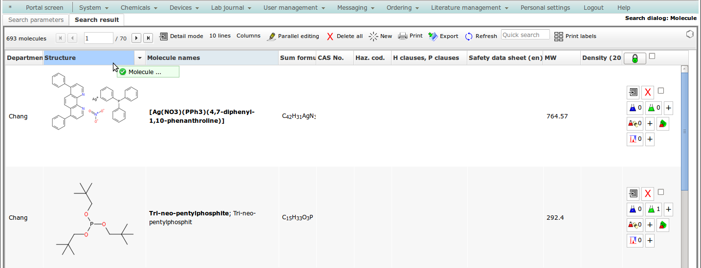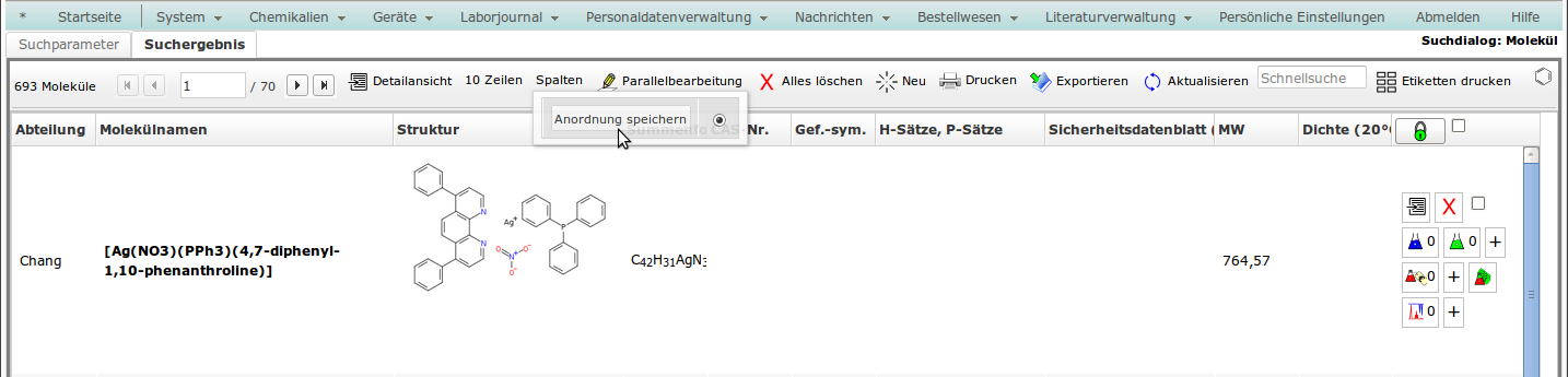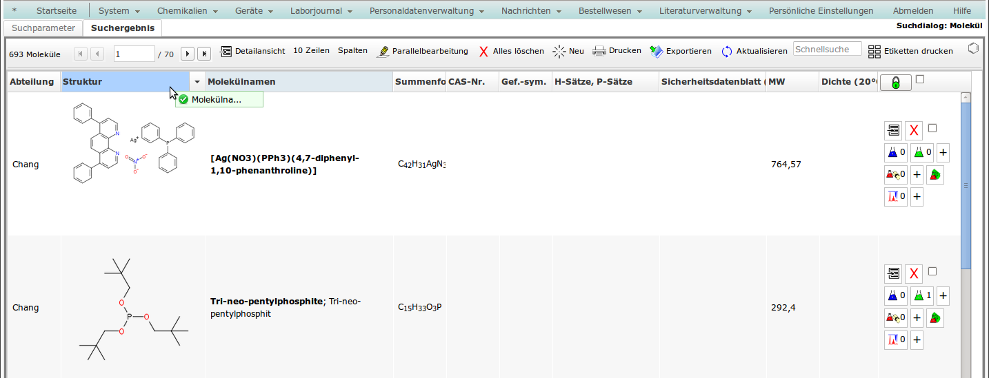 • Das Symbol ganz rechts zeigt an, aus welchem Objekttyp die Ergebnisliste besteht, z.B. Substanzen, Gebinde oder Experimente. The symbol on the very right indicates the object type of the current result list, e.g. substances, containers or experiments.