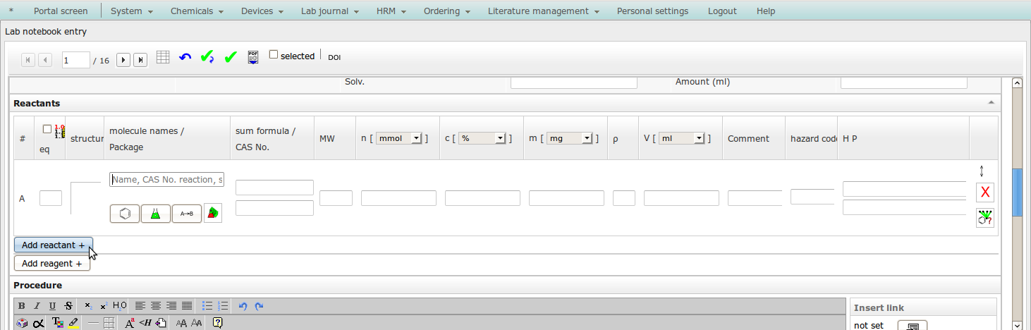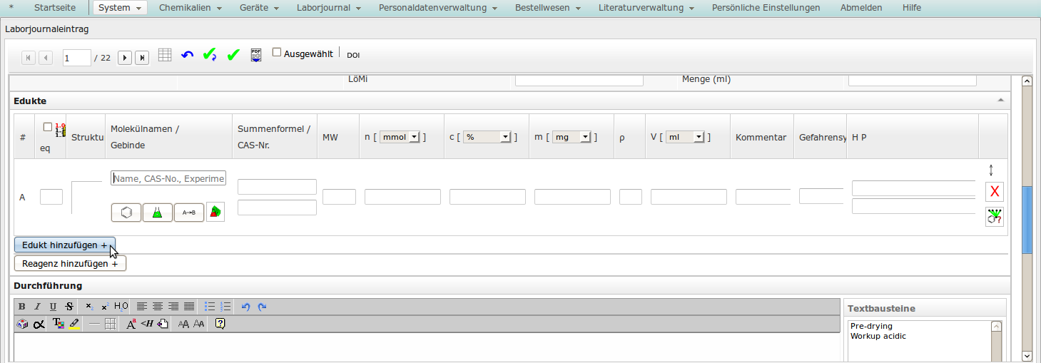 Im Bearbeitungsmodus können Sie normalerweise alle Werte im Formular verändern. Nicht möglich ist z.B. die nachträgliche Änderung des Laborbuchs für einen Laborjournaleintrag. Klicken Sie am Ende auf Speichern und Beenden, um die Werte in der Datenbank zu speichern, oder auf Abbrechen, wenn keine Änderung durchgeführt werden soll. Wenn Sie versuchen, im Bearbeitungsmodus den Datensatz zu wechseln oder zu einer anderen Internetseite zu wechseln, so wird ein Hinweis angezeigt, um Ihnen zunächst das Speichern der geänderten Daten zu erlauben. In the editing mode, under normal circumstances you can alter all data in the form. However, some changes may be restricted, like subsequently reassigning an experiment to a different lab notebook. When you have performed all neccessary changes, click Save and exit to write the new values to the database, or click Cancel to discard the changes. If you try to navigate to a different dataset or a different website, a warning will be displayed, allowing you to save your data.