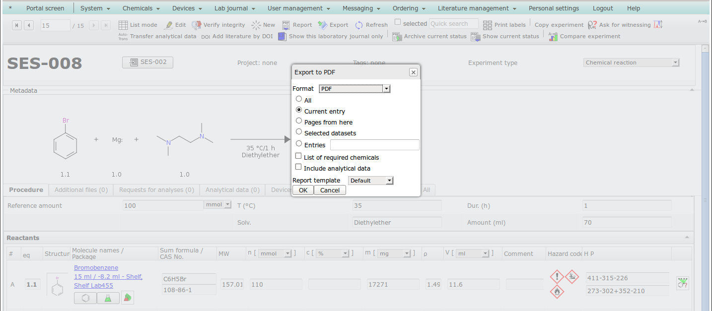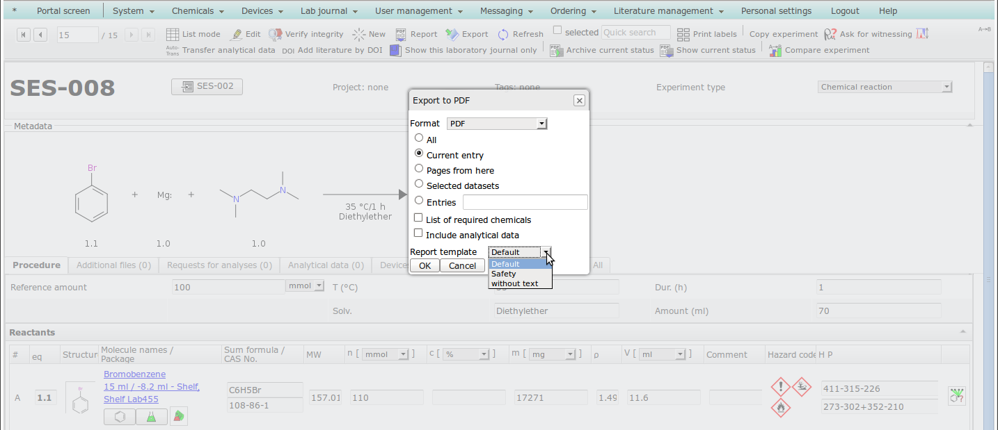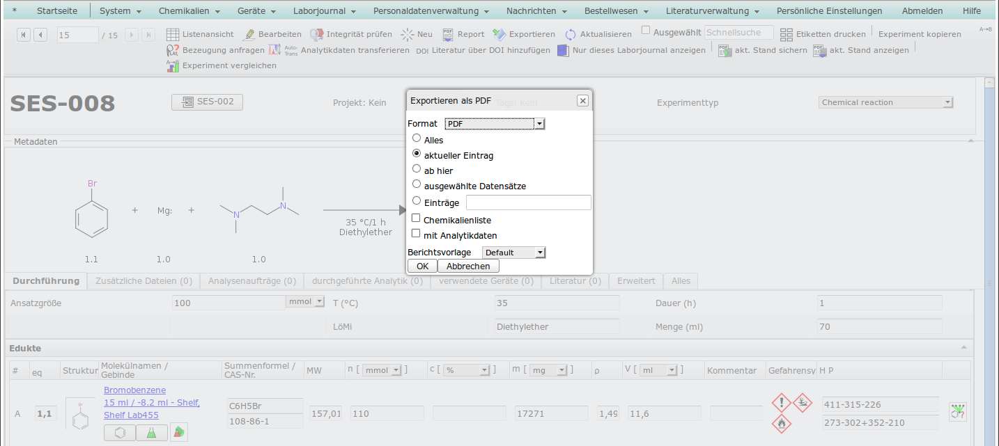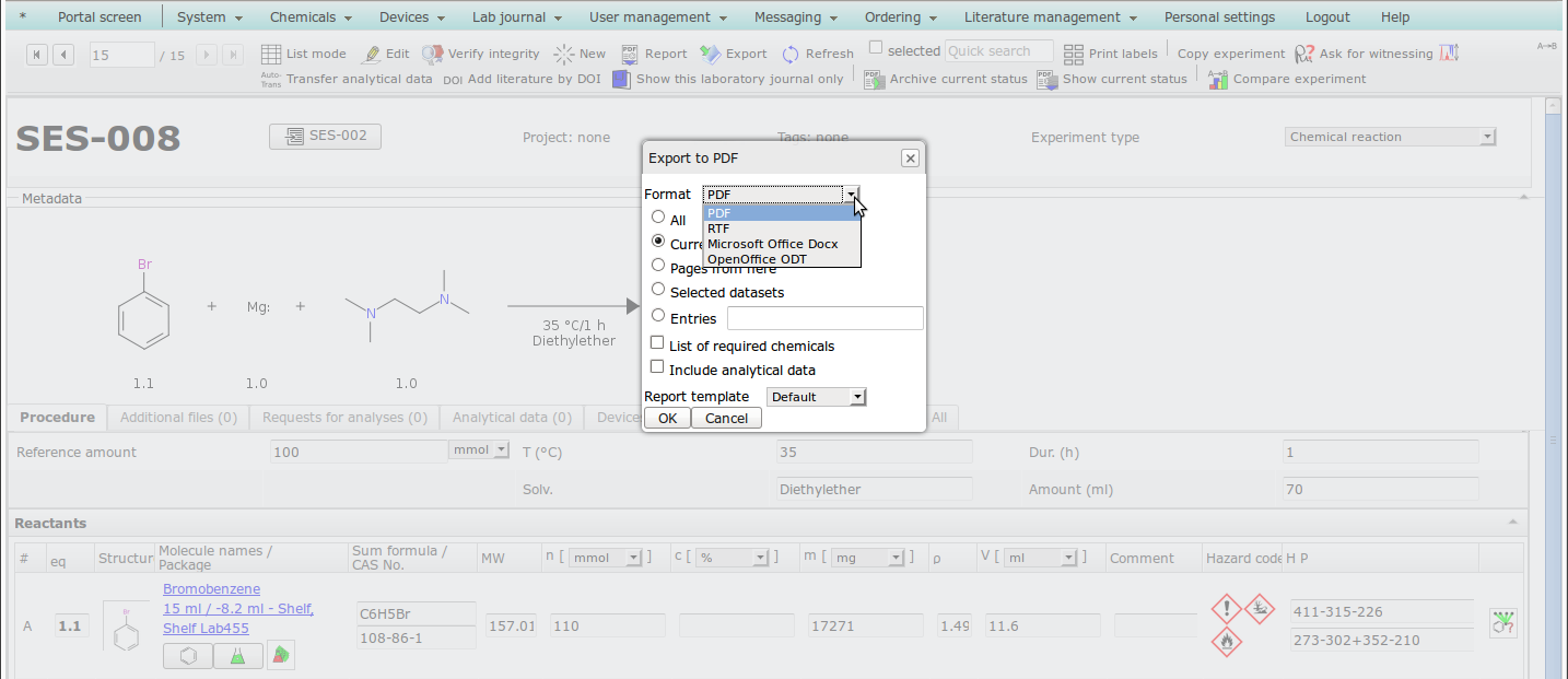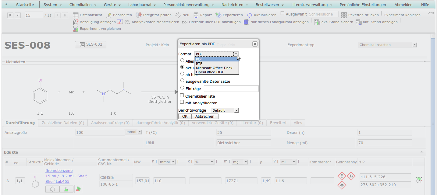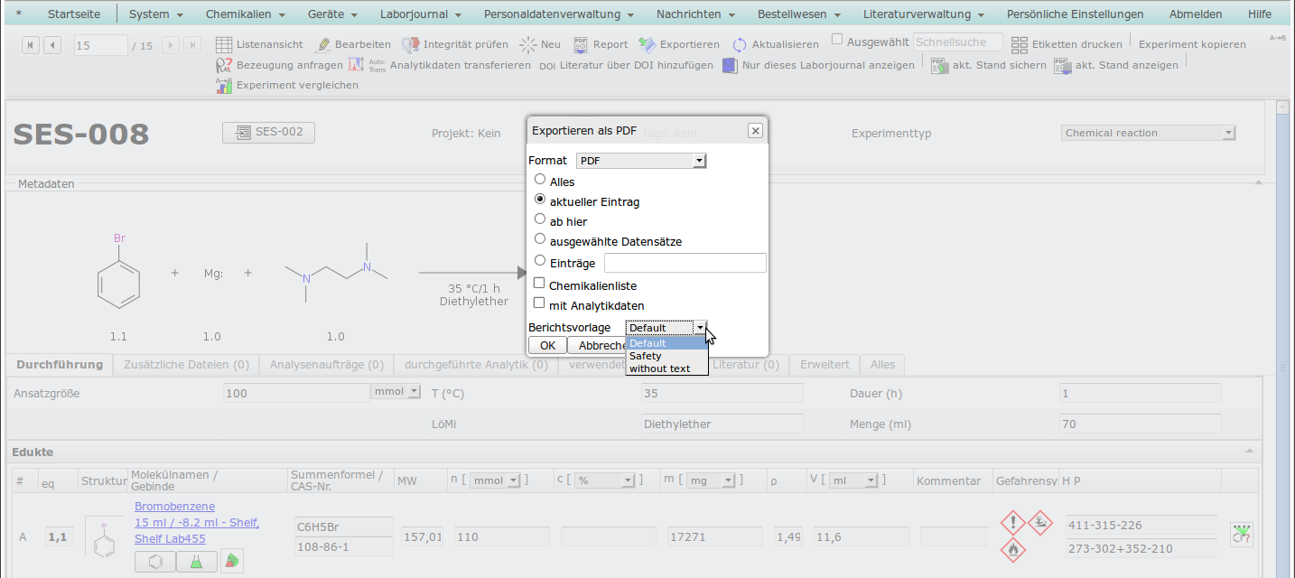 Unter Umständen können Sie eine Liste der benötigten Chemikalien anfordern, die Analytikdaten mit in den Bericht aufnehmen oder zwischen verschiedenen Vorlagen auswählen. You may be able to request a list of required chemicals, have any analytical data included in the report or choose between multiple templates.