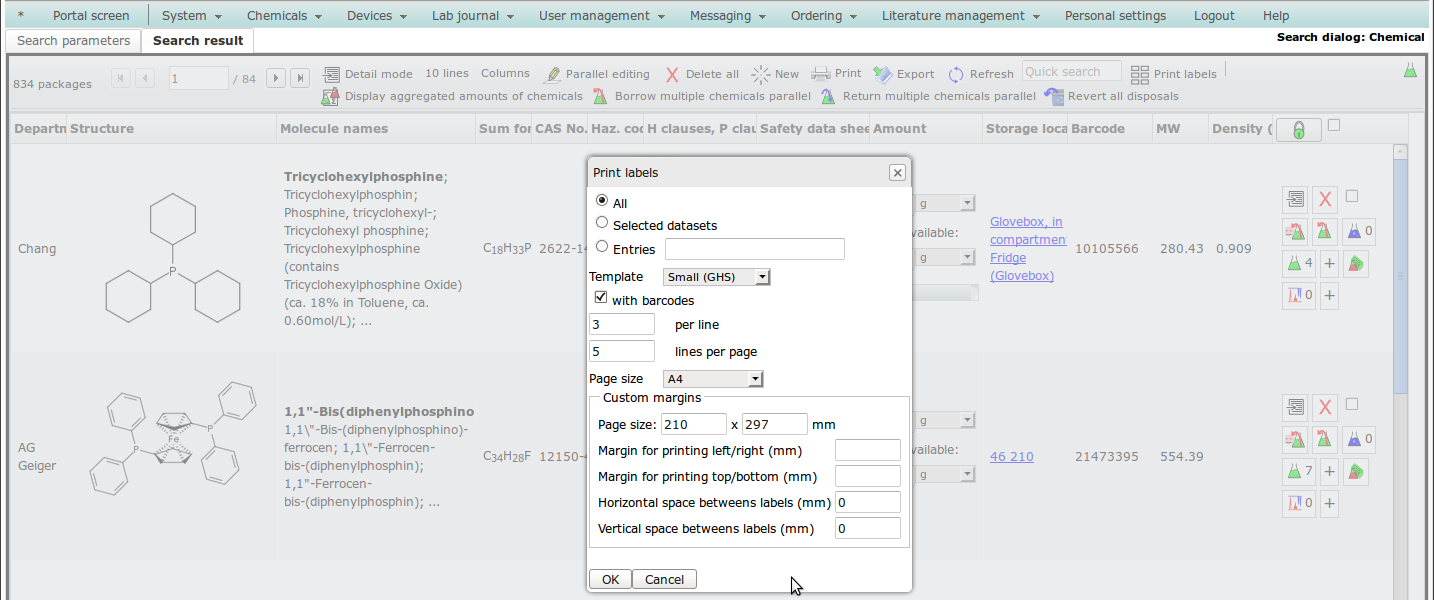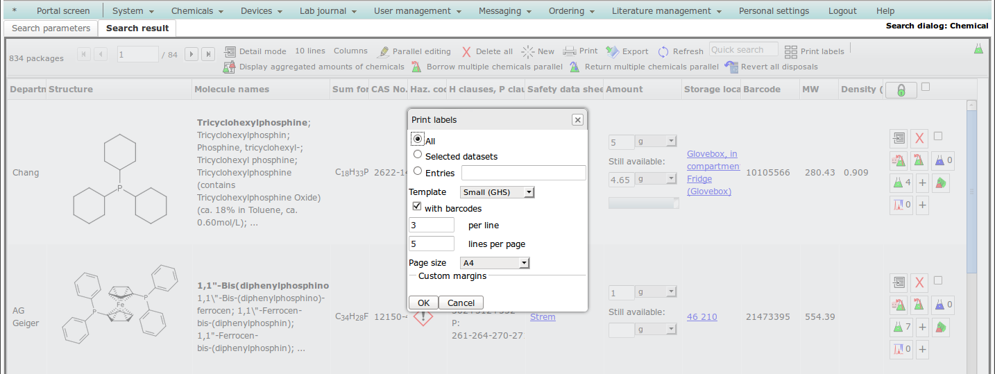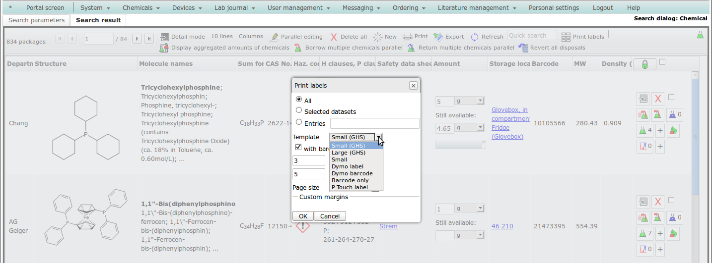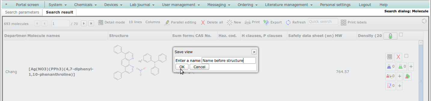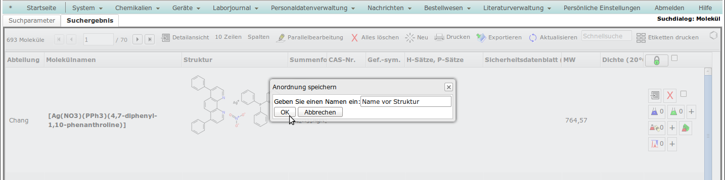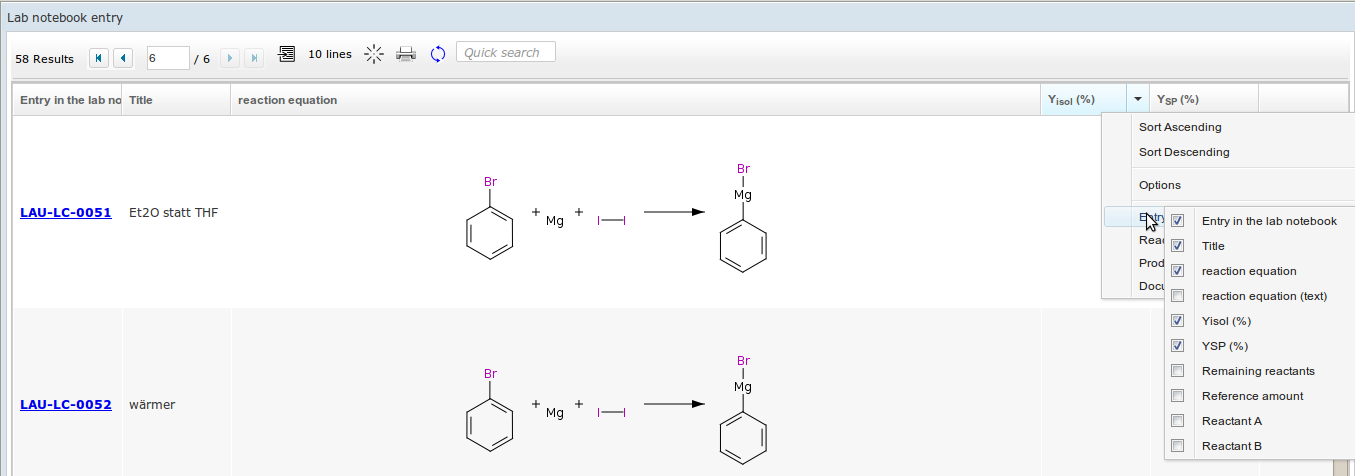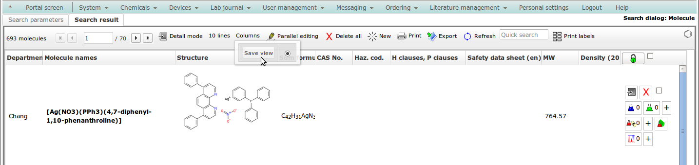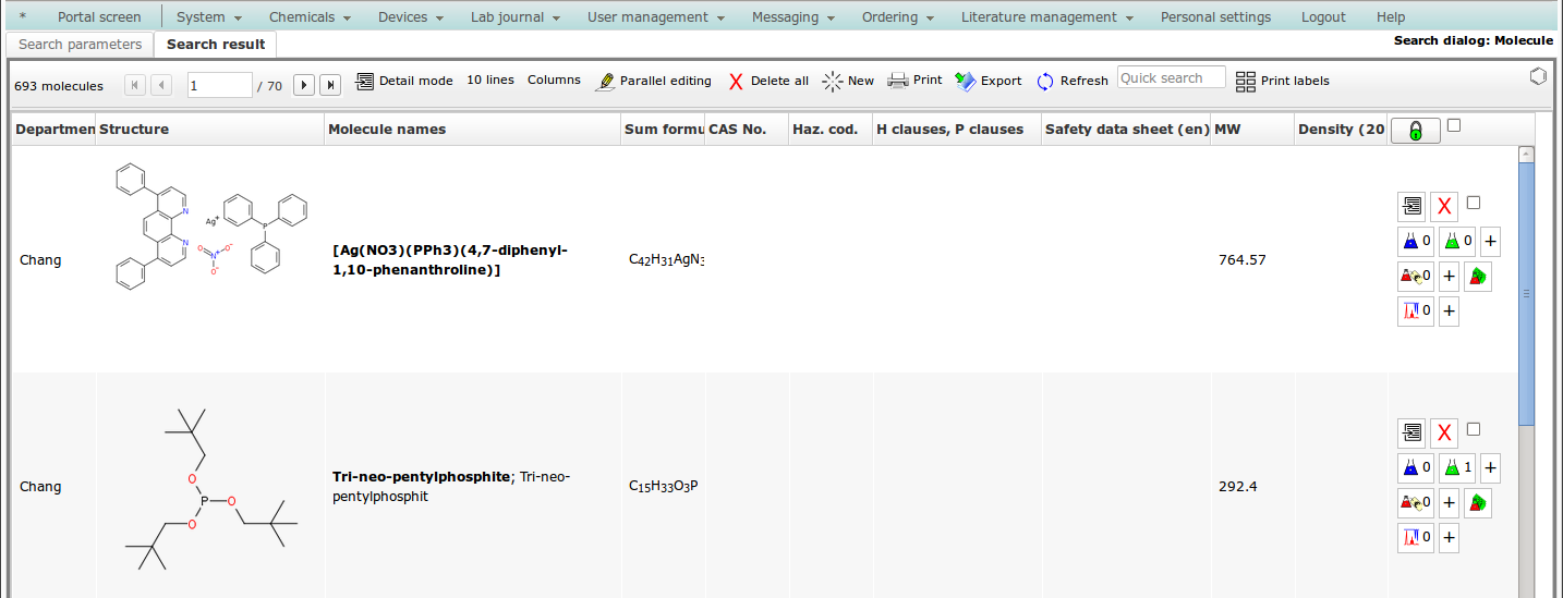 The search functions within Sciformation ELN create result lists, which can be displayed in list view or detail view. Depending on the type of data and the server setup, the result lists can also be used