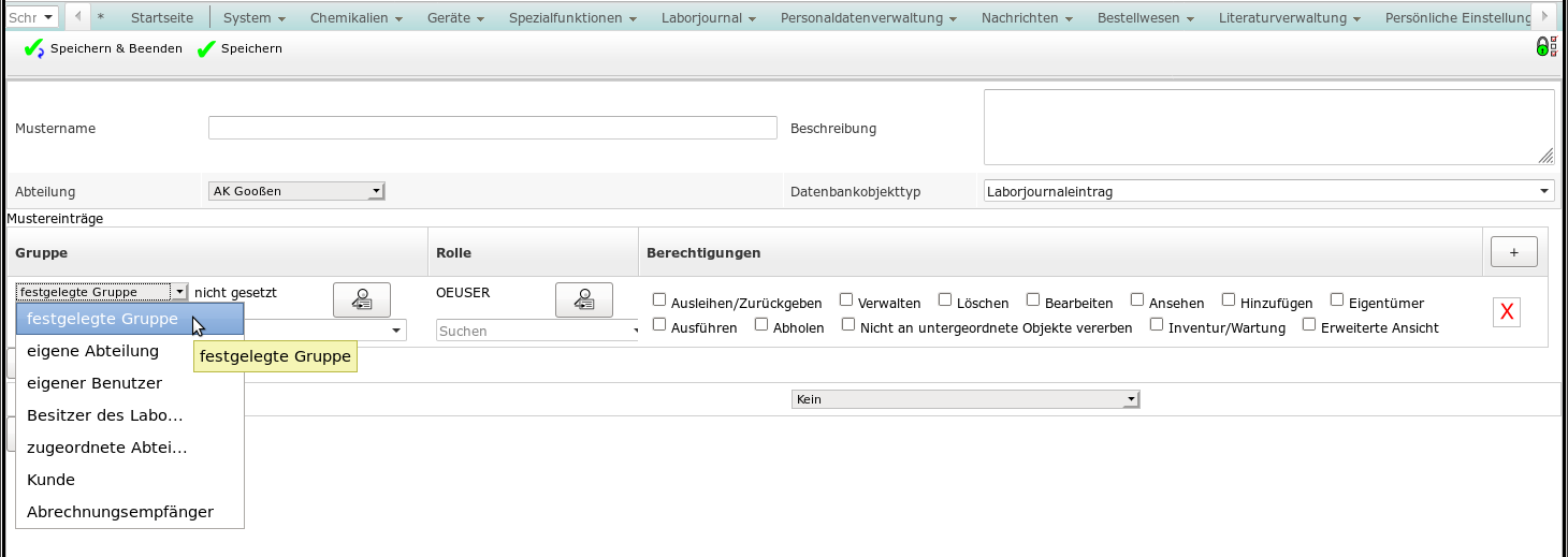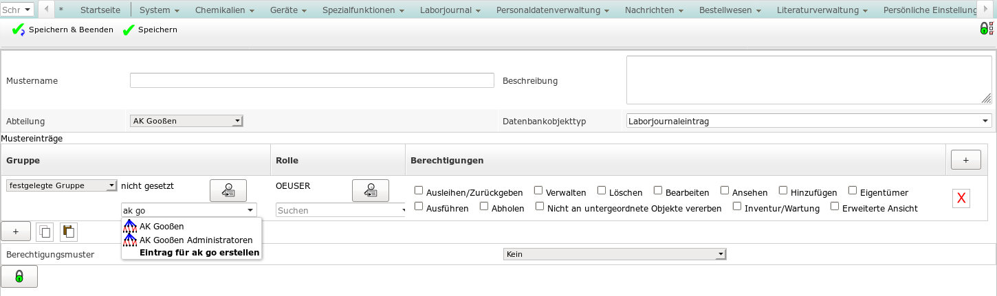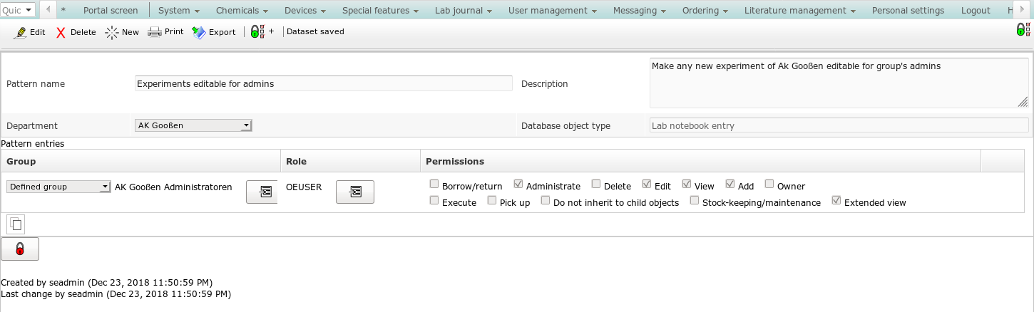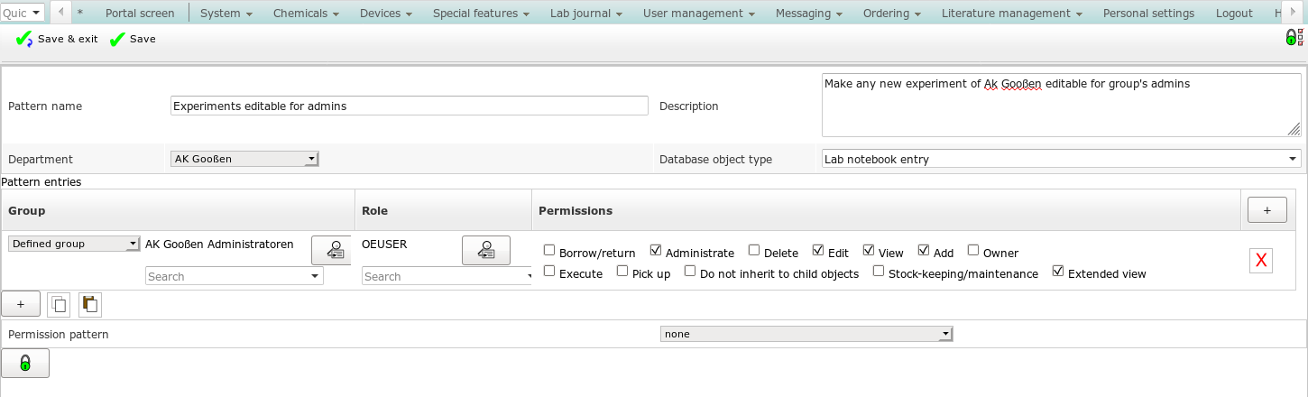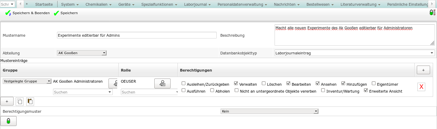 Beim Anlegen neuer Datensätze muß auch entschieden werden, welche Gruppen/Rollen welche Zugriffsrechte auf einen Datensatz haben sollen. In der Praxis werden selten mehr als 3-4 unterschiedliche Konstellationen nötig sein, in vielen Fällen dürften sogar immer wieder die gleichen Berechtigungen gewünscht sein. Deshalb kann man sog. Berechtigungsmuster anlegen, die diese Standardkonstellationen widerspiegeln. When creating a new dataset, the user must decide which groups/roles should have which permissions to access or modify the dataset. Normally, not more than 3-4 different arrangements will be used for a certain department, in many cases there will be always the same permission settings. Therefore it is possible to create so-called permission patterns to reflect these standard cases.