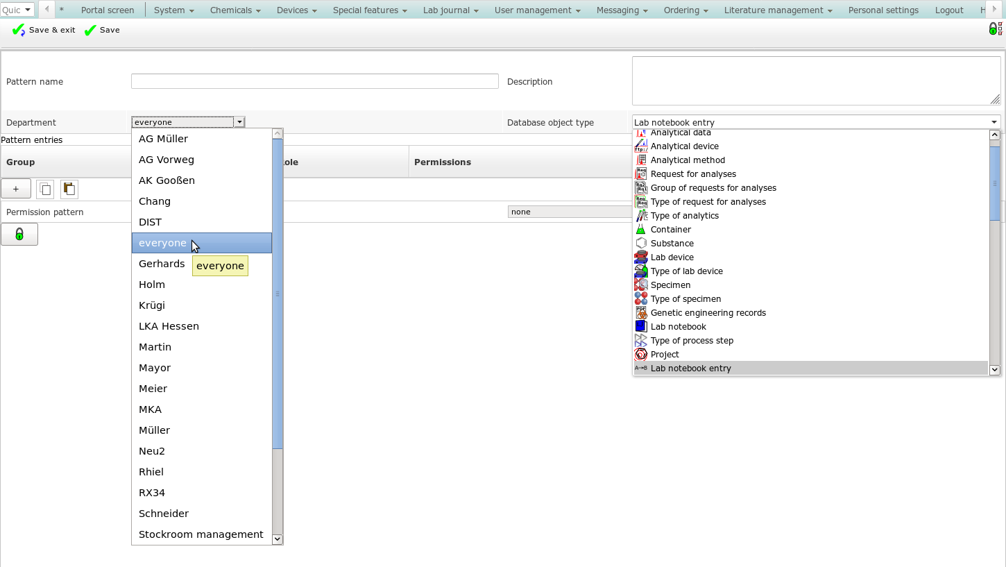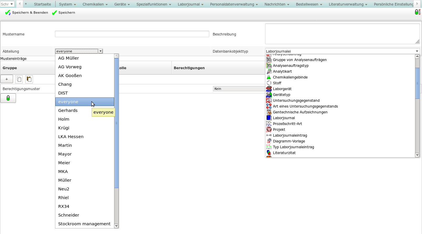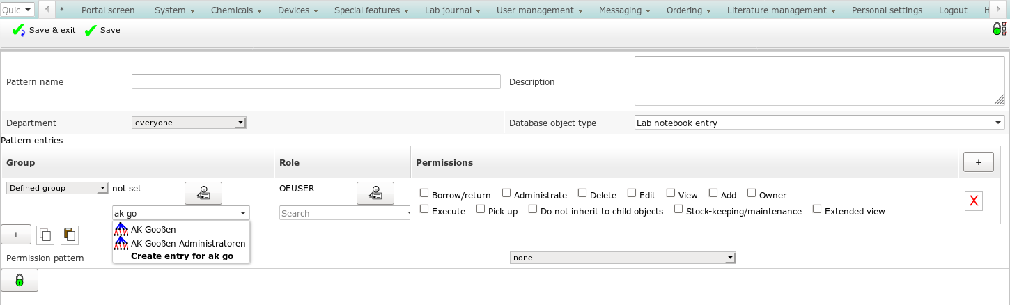 Beim Anlegen neuer Datensätze muß auch entschieden werden, welche Gruppen/Rollen welche Zugriffsrechte auf einen Datensatz haben sollen. In der Praxis werden selten mehr als 3-4 unterschiedliche Konstellationen nötig sein, in vielen Fällen dürften sogar immer wieder die gleichen Berechtigungen gewünscht sein. Deshalb kann man sog. Berechtigungsmuster anlegen, die diese Standardkonstellationen widerspiegeln. When creating a new dataset, the user must decide which groups/roles should have which permissions to access or modify the dataset. Normally, not more than 3-4 different arrangements will be used for a certain department, in many cases there will be always the same permission settings. Therefore it is possible to create so-called permission patterns to reflect these standard cases.