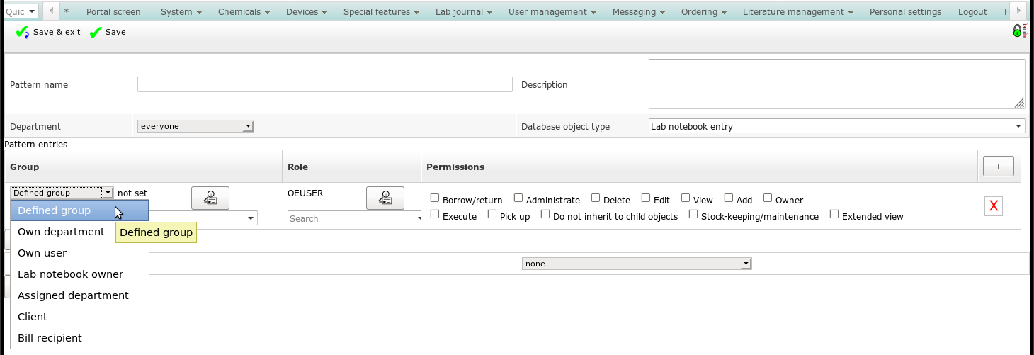 Neben statischen Gruppenzuordnungen können Sie auch einstellen, daß die betreffende Gruppe aus dem Kontext des jeweiligen Datensatzes verwendet werden soll, z.B. die zugehörige Abteilung. Click to add entries to the list of permissions for a combination of group and role, as they should be granted when the pattern is used. For entries that should apply to all groups or all roles, just use the group everyone or the role OEUSER, respectively, where every user is member of.