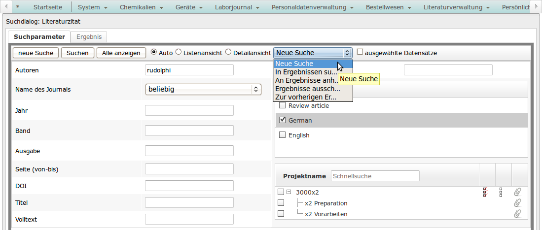 Wenn die Suche in der Datenbank abgeschlossen ist, dann werden die Ergebnisse in der Registerkarte "Ergebnis" angezeigt. Durch Klicken auf "Suchparameter" können Sie die Suchkriterien verändern und damit die Suche erneut durchführen, bis Sie die gewünschten Ergebnisse gefunden haben. Das Auswahlfeld "Listenoperation" ermöglicht es, die aktuelle Ergebnisliste