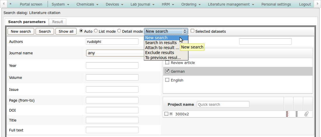When the search is complete, the results will be displayed in the "Results" tab. Modify the search criteria by returning to the form via "Search parameter" until you have found the desired results. The select box "List operation" allows you
